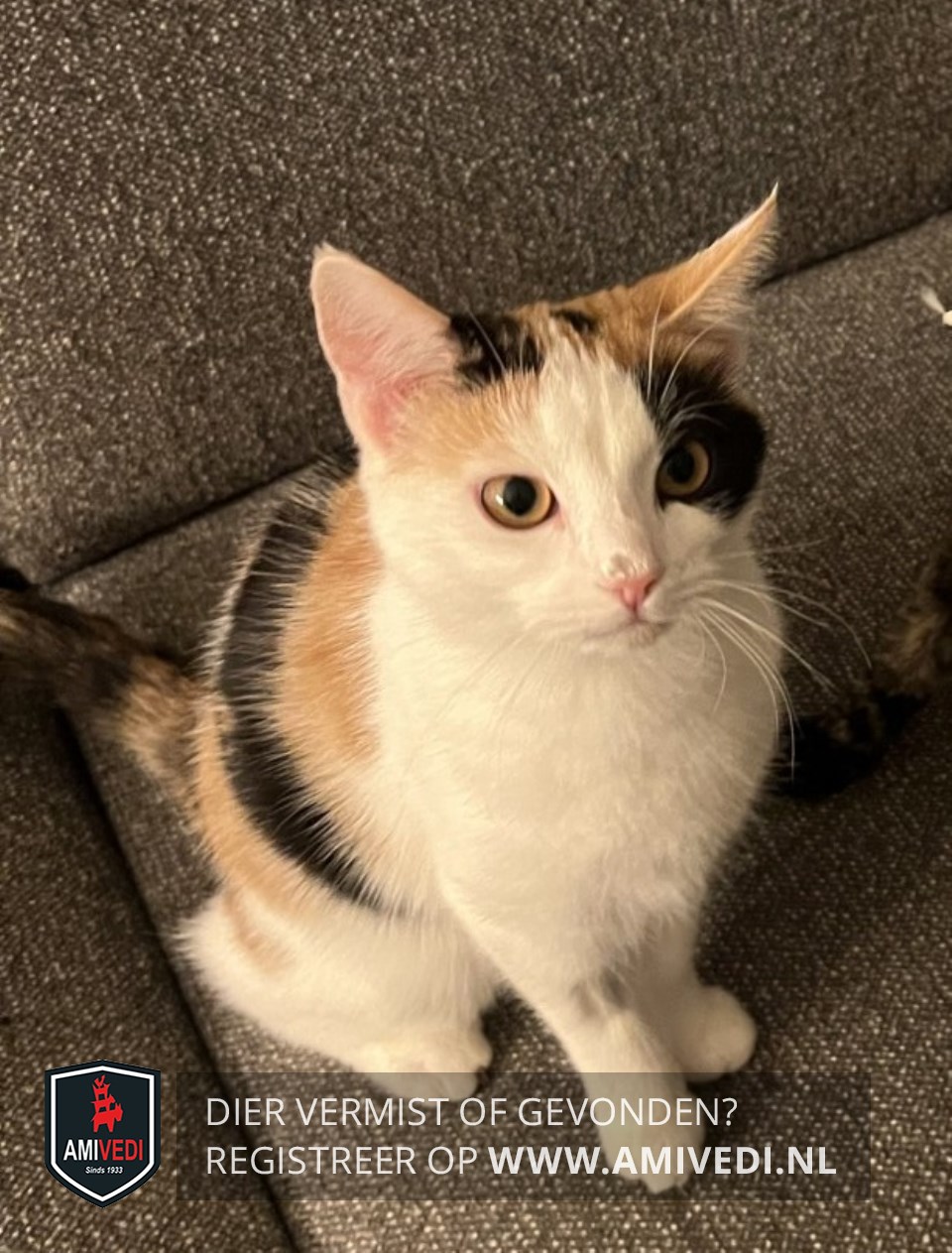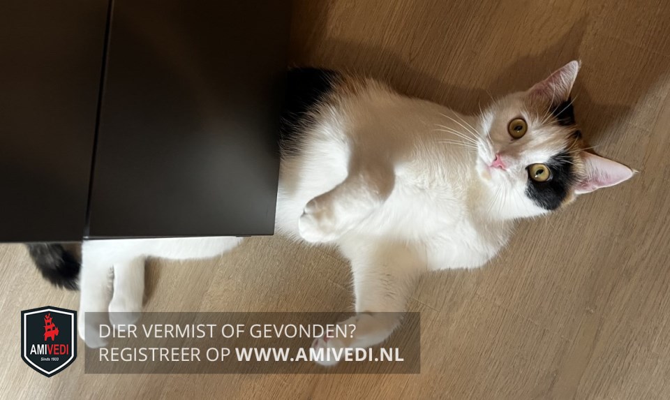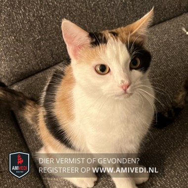 | Signalement | Lapjespoes, wit met zwart en oranje. Bij linkeroog een zwarte vlek, boven rechteroog licht oranje, bovenop kopje 2 zwarte vlekken. Linkeroortje oranje, over de rug oranje en zwart gevlekt. Staart zwart met oranje gemêleerd. |