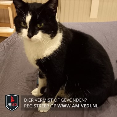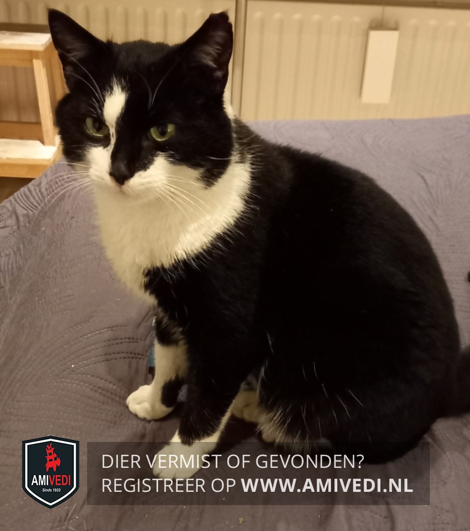 | Signalement | Zwart, witte vlek boven rechter oog, witte kin, borst, uitlopend naar hals, witte sokjes |
