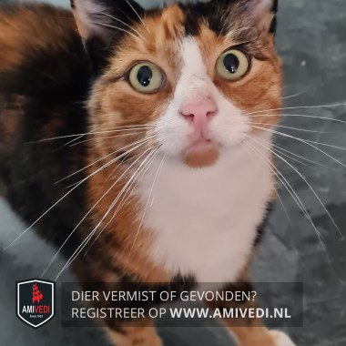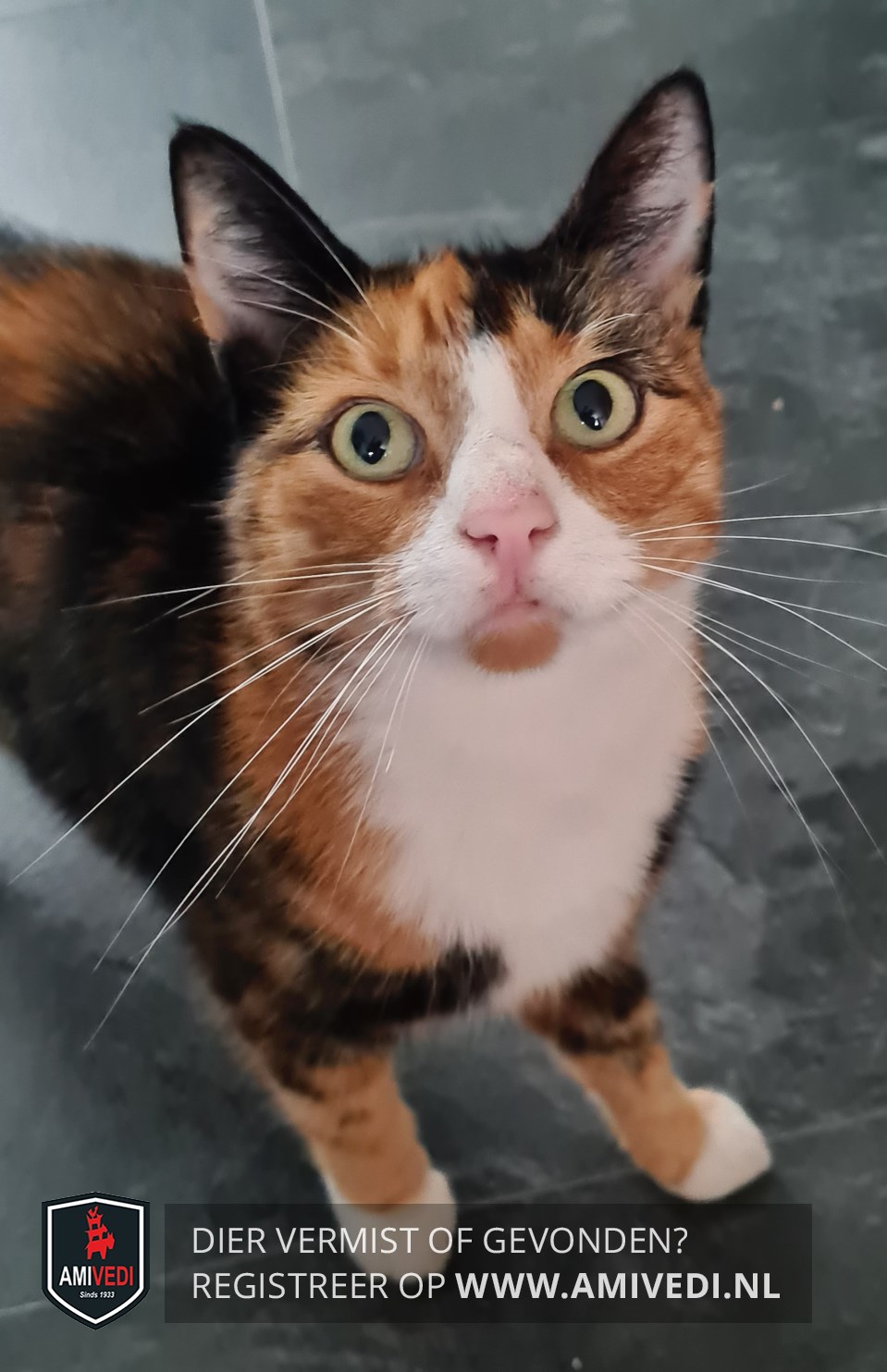 | Signalement | Lapjes poes, zwart rood en wit Zwarte vlek op de kop over de beide oortjes en het hele achterhoofd doorlopende naar de rug, rode vlek links beginnend boven het linker oog over het oog naar de wang aflopend, rechts op het voorhoofd beginnend een rode vlek over het oog naar de rechter wang aflopend, witte lijn op de voorhoofd over neusbrug naar wit snuitje, rode vlek voorop de kin, witte borst doorlopend tussen de voorpoten, beide voorpootjes onder aan de poten een rode sok met wit voetje, rode vlek op de rechter schouder, rode vlek ter hoogte van de heupen op de rug, wit vlekje op de uiteinde van de staart. |