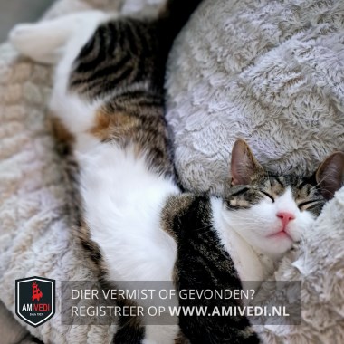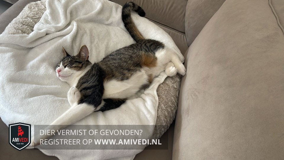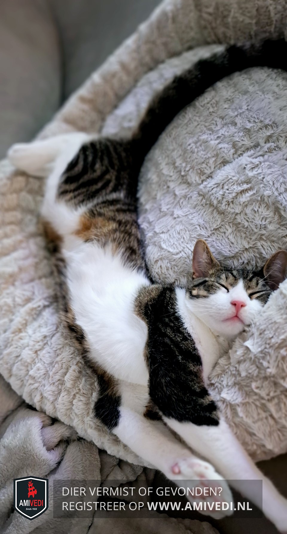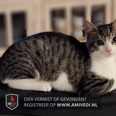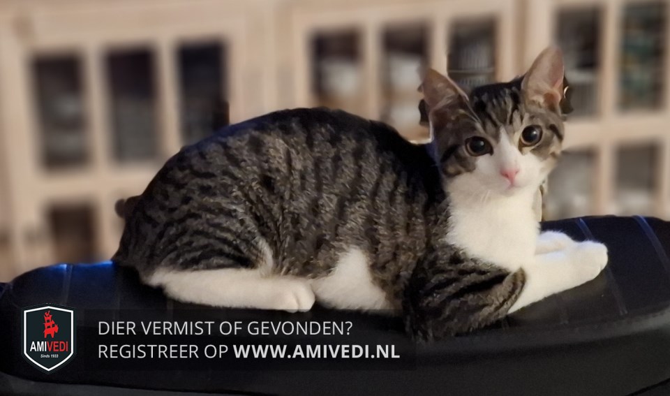 | Signalement | Europese korthaar, wit met bruin/grijs en zart gestreept. Bovenkant kopje, wangen en oren bruin/grijs met zwart gestreept. Over de rug en flanken bruin/grijs met zwart gestreept dek, bij heupen op de buik bruine vlekken. Vanaf de ellebogen aan voorpoten zwart met bruin/grijs gestreept doorlopend naar de rug. |
