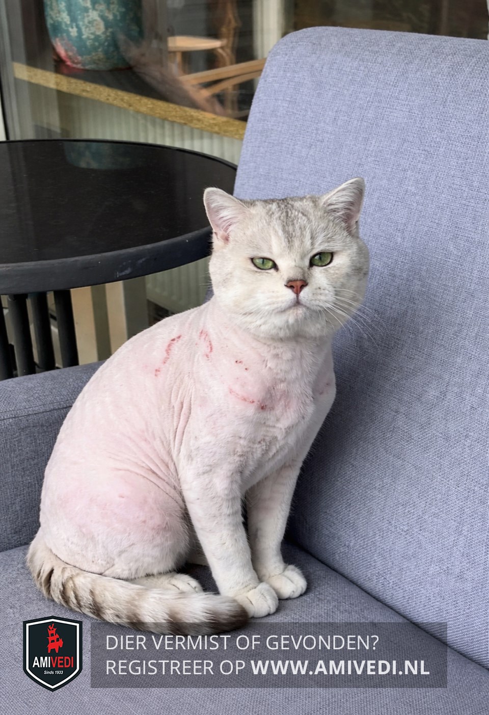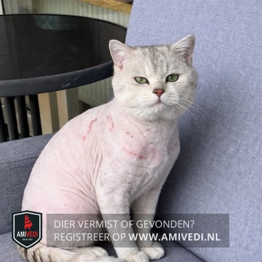 | Signalement | Ras: British Shorthair (geschoren) Ligt cypers getekend. Kleur: Licht crème / wit. • Ogen: Groen • Groot deel van het lichaam is geschoren • Staart is kaal met een dunne gestreepte zwarte laag erop • Wond bij de wenkbrauw, daardoor geen haar op die plek • Verwondingen op de nek en het lichaam door een aanval van een andere kat |