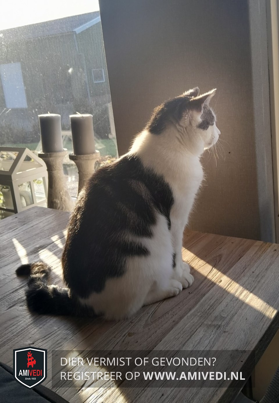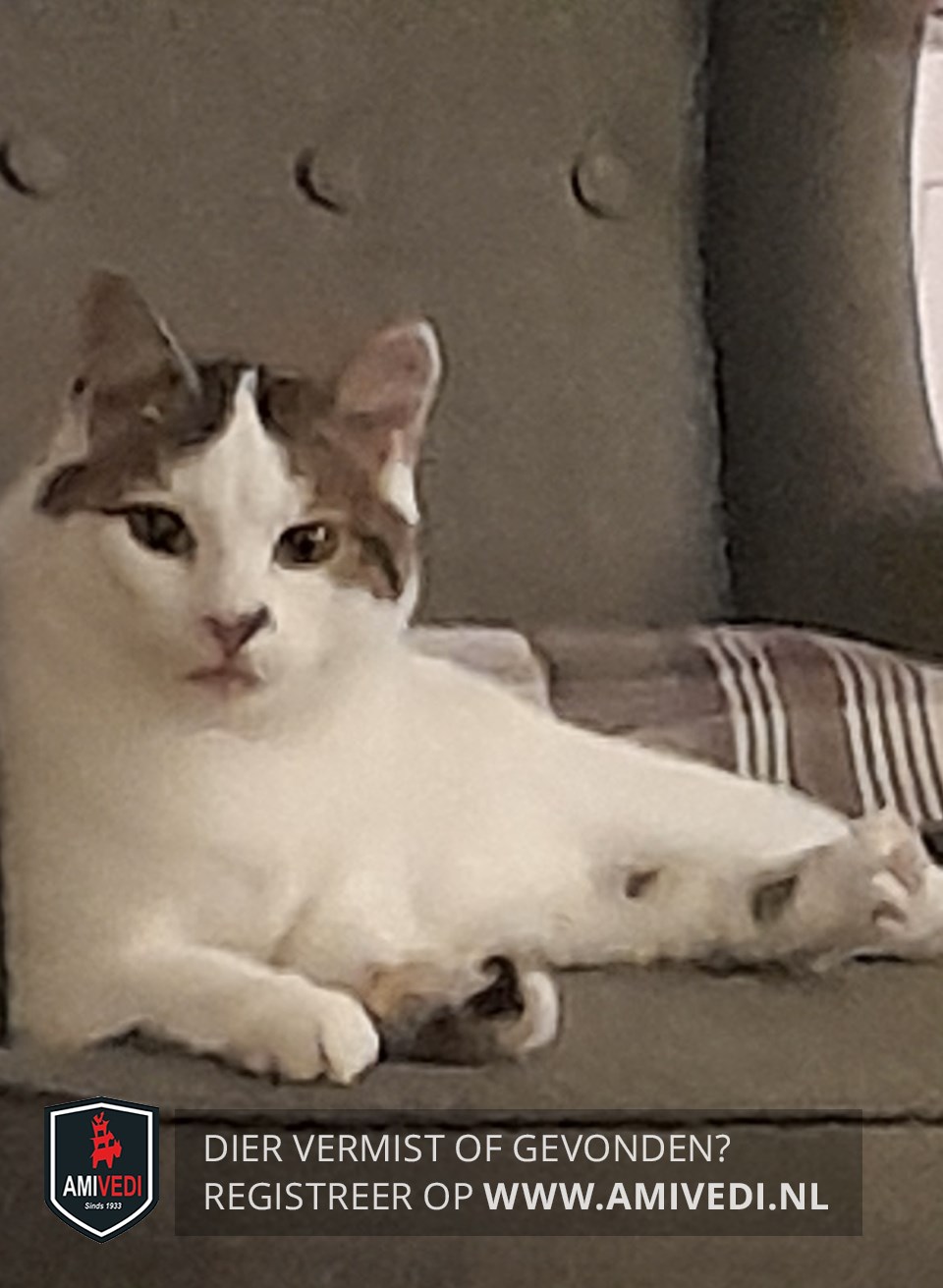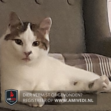| Signalement | Wit met cypers bruine vlekken bovenop de kop en op de rug, bruin vlekje links van de neus, donkere staart, klein beetje zwart op het voetje linksvoor en aan de binnenkant van de rechter achterpoot. |