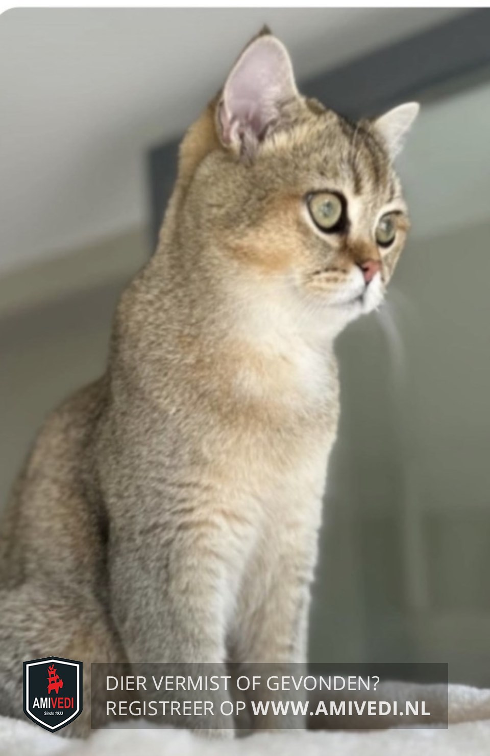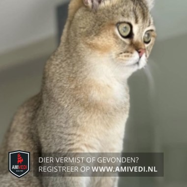 | Signalement | Beige Britse korthaar met een kaal plekje achter zijn oor, beige gemêleerd met grijs en wit. Met wit snoetje wat doorloopt naar de borst |