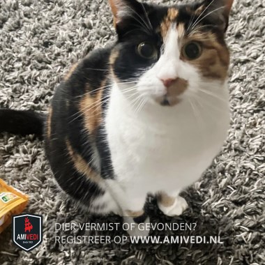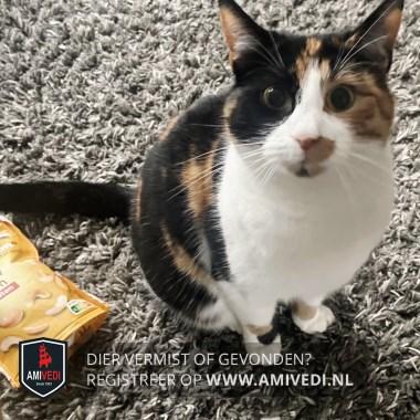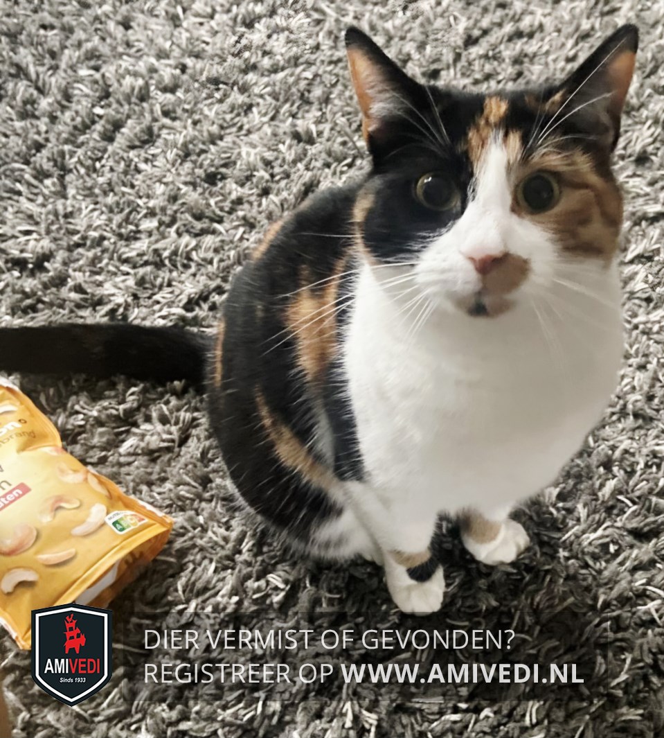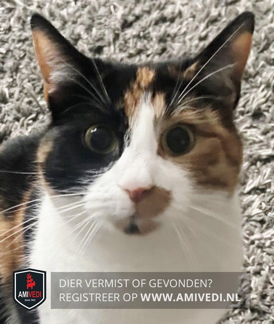 | Signalement | Kleine lapjespoes zwart-wit-rood. Witte snuit met rood onder linker neusgat en zwart-rood vlekje op de kin. Rood over linker oog, zwart over rechter oog. Borst, buik en poten wit met hier en daar wat vlekjes. Over rug en flanken zwart-rood gevlekt. Staart vooral zwart. |