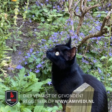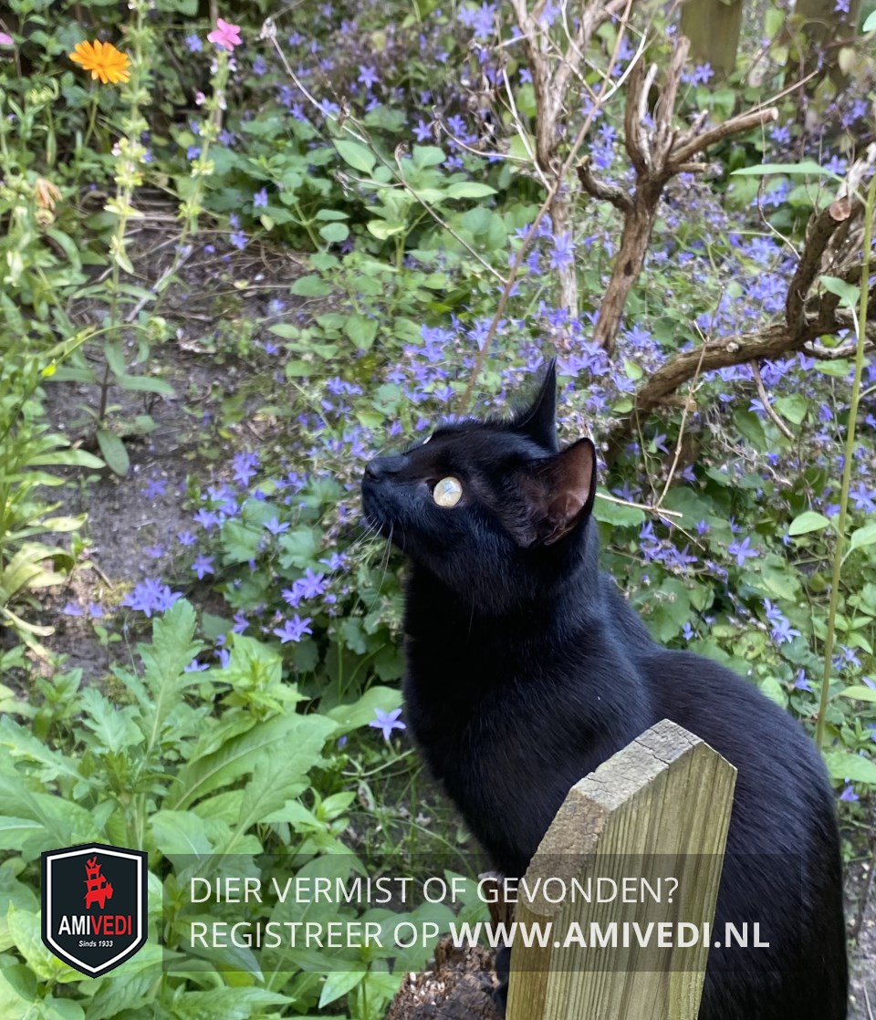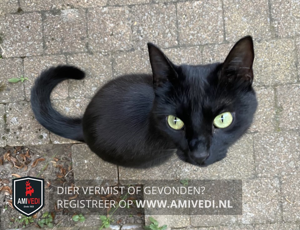 | Signalement | Zwart met een paar witte haartjes door de vacht, lange staart en gele ogen. |