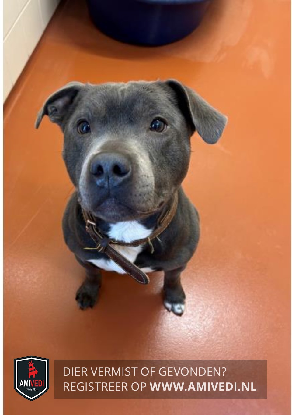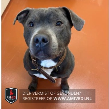 | Signalement | Engelse Stafford licht grijs om de snuit, wit op de borst, witte teentje linksvoor |