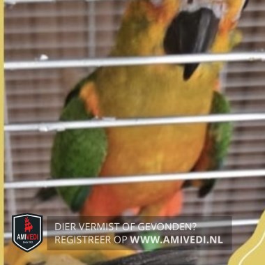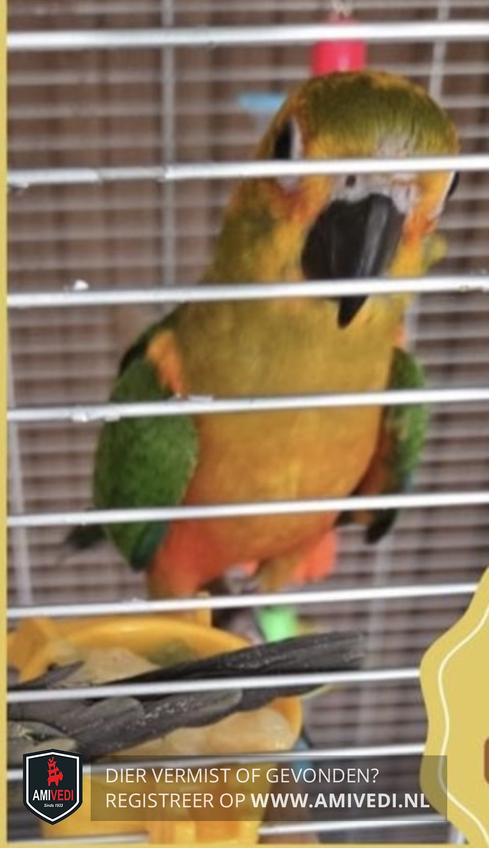 | Signalement | Zonparkiet met groen kopje, geel/oranje borst en groene vleugels. Zwarte snavel, donkere ogen en grijsroze pootjes. |
