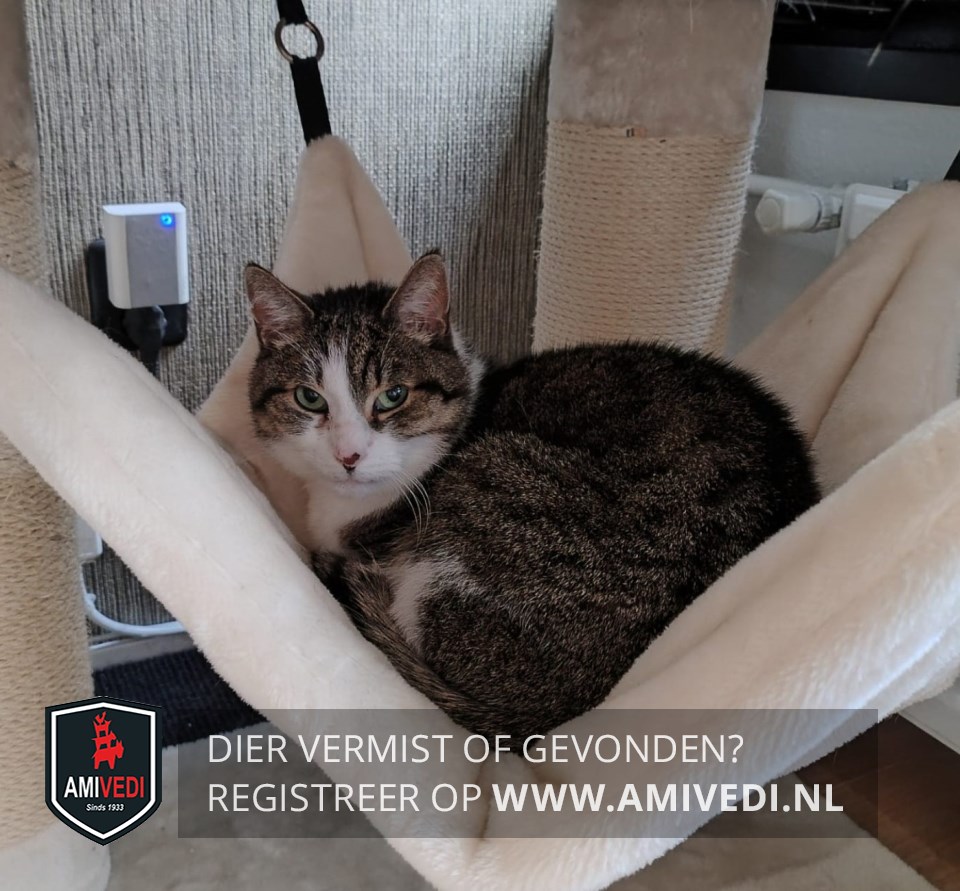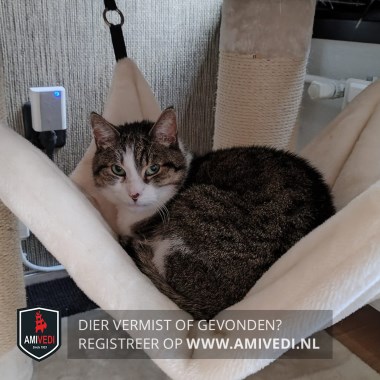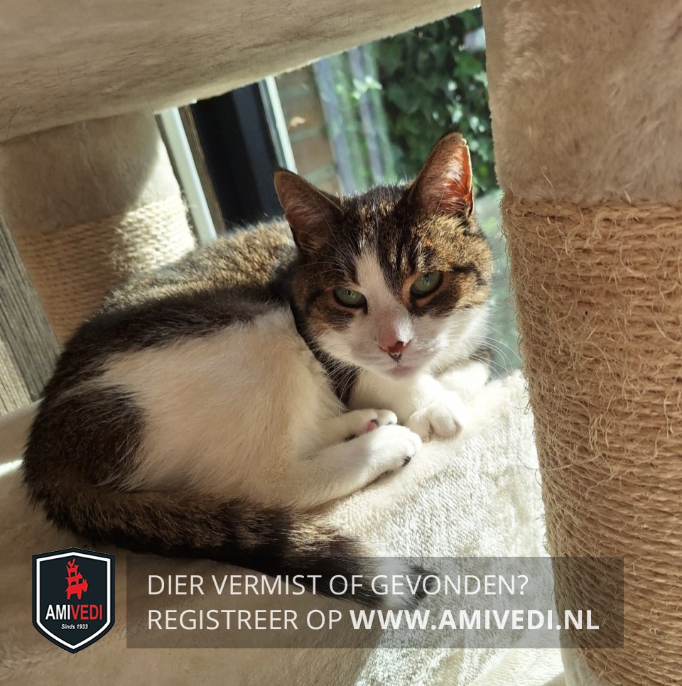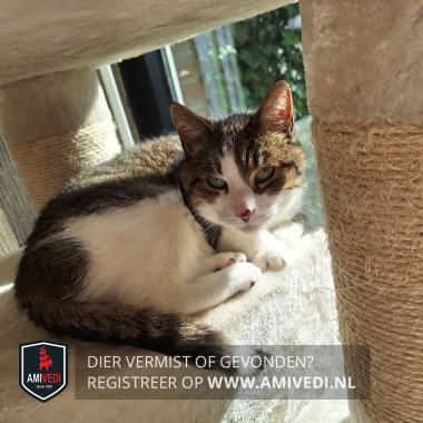 | Signalement | Wit/cypers bruin/grijs/zwarte kater. Op het kopje cypers bruin/grijs/zwart dat doorloopt over en langs de oogjes. Wit neusje, het wit loopt door over het voorhoofd. Donker vlekje op zijn neus. Groene ogen (met vleugje blauw). Licht randje om de oogjes. Witte hals en bef. Wat wit op de buik. Lijfje is cypers bruin/grijs/zwart, rechterzijde van het lijfje is wit. Loopt een heel kleine beetje mank, voornamelijk zichtbaar bij langzaam lopen. BINNENKAT. Erg schuw. |