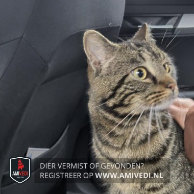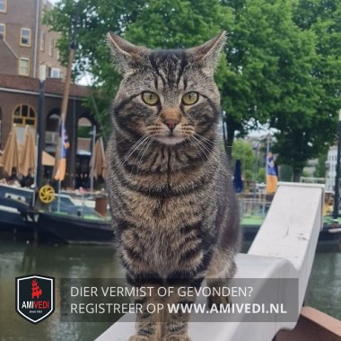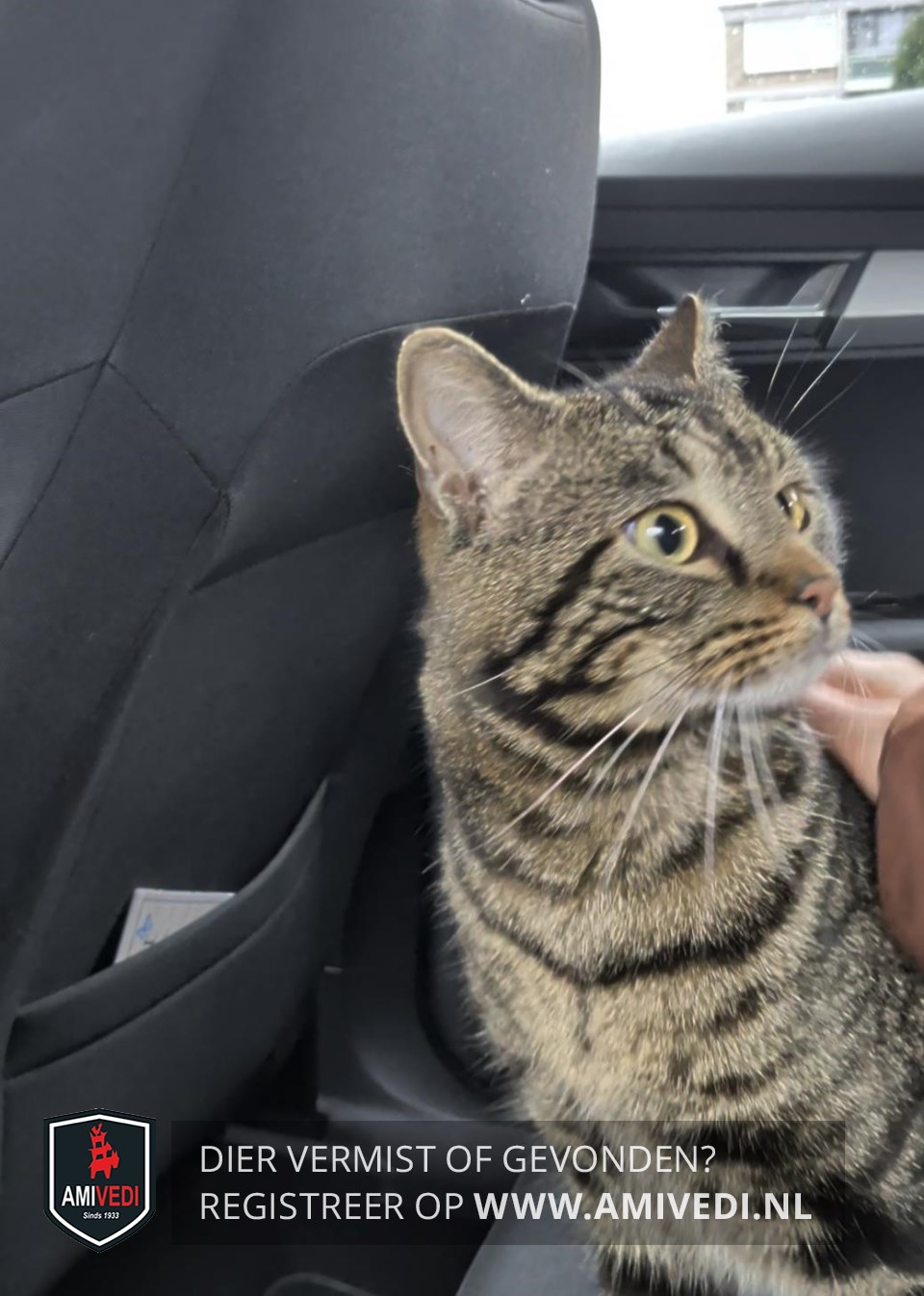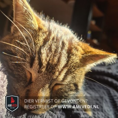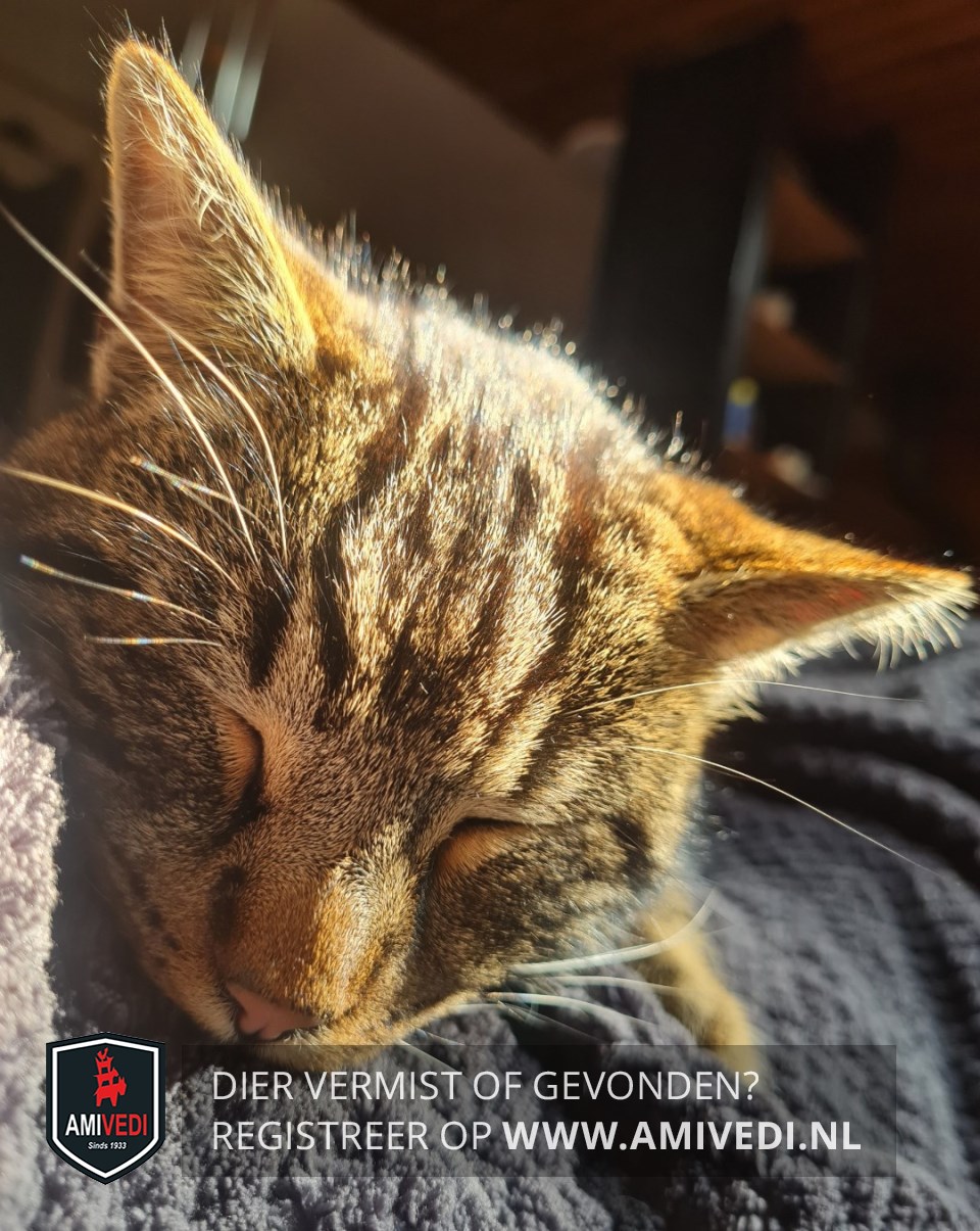 | Signalement | Cypers bruin zwart gestreepte kater met een bruine neus en wat wit aan de bek. Cypers gestreept lijfje en pootjes. |