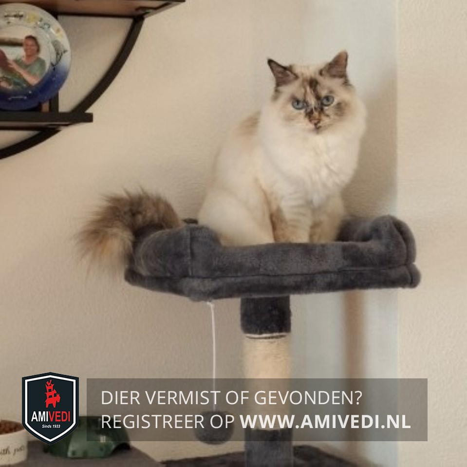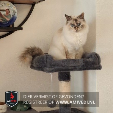| Signalement | Wit beige kop Wat dikkere vacht kraag in nek Beige vlekjes op de pootjes Middellange vacht Beige staart |
