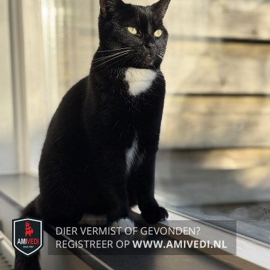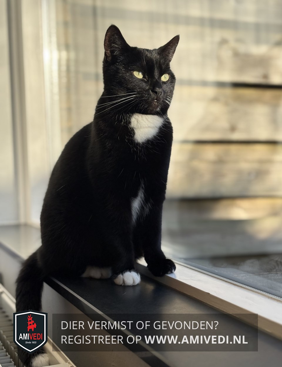 | Signalement | Zwarte kop, rug, zijflanken en staart. Staart heeft een wit puntje. Witte driehoekige vlek op de bef. Witte streep vanaf de borst naar de buik. Rechter voorpoot zwart met witte teentjes. Linker voorpoot zwart met op 2 teentjes kleine witte streepjes. Achterpoten zwart met witte voetjes. Sterk en gespierd poesje. Deels witte en zwarte snorharen. |