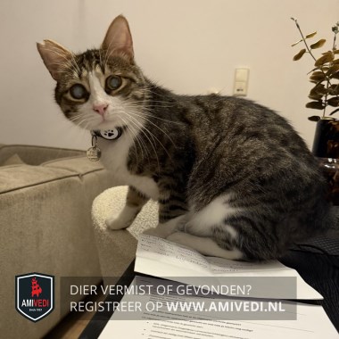 | Signalement | Cypers zwart/grijs, witte bles en bef doorlopend naar buik. Voorpoten witte sokken, achterpoten wit tot aan hak, hapje uit rechteroor. Blind, heeft witte waas over de ogen |