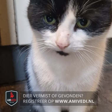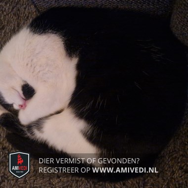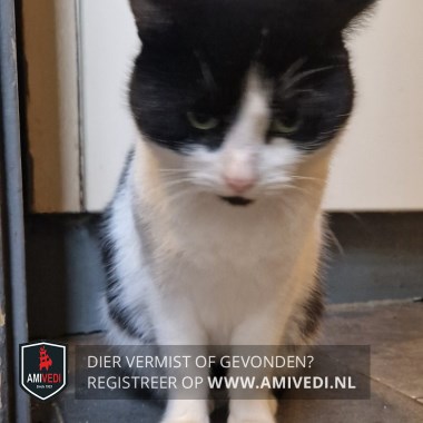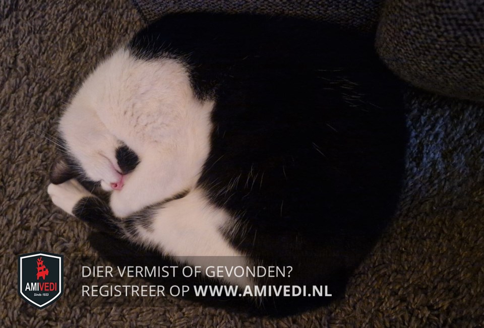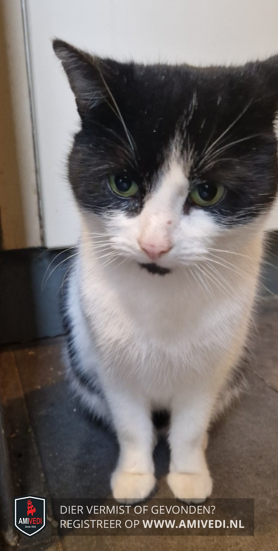 | Signalement | Europese korthaar, zwart met wit. Bovenkant kopje en oren zwart, witte bles, witte snuit met zwart kinnetje. Witte bef, witte borst en witte buik. Voorpootjes volledig wit, achterpoten wit met zwart bij de knieën. Staart zwart. |