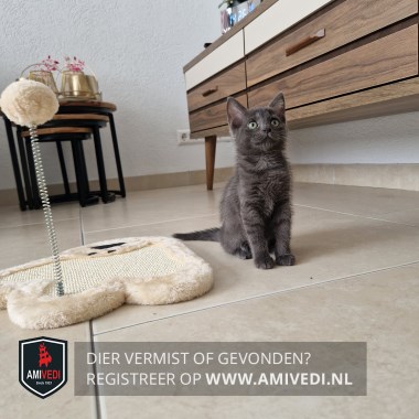 | Signalement | Grijs/zwarte ietwat gestreepte vacht met een wit stipje op de buik. |