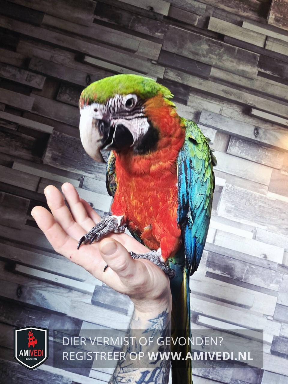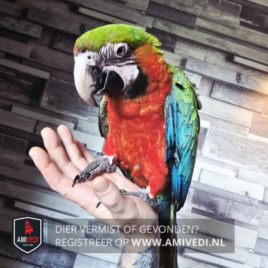 | Signalement | Harlekijn ara Vermist Heeft een scheve snavel Beschadiging aan de vleugel rechs Heeft een ring en chip Afhankelijk van medicijnen |