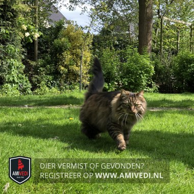 | Signalement | Cypers bruin/zwart gemêleerde langharige kater. Lijkt groot vanwege de lange haren maar hij is 3,5 kg. Speciaal dieetvoer nodig tegen blaasgruis. |