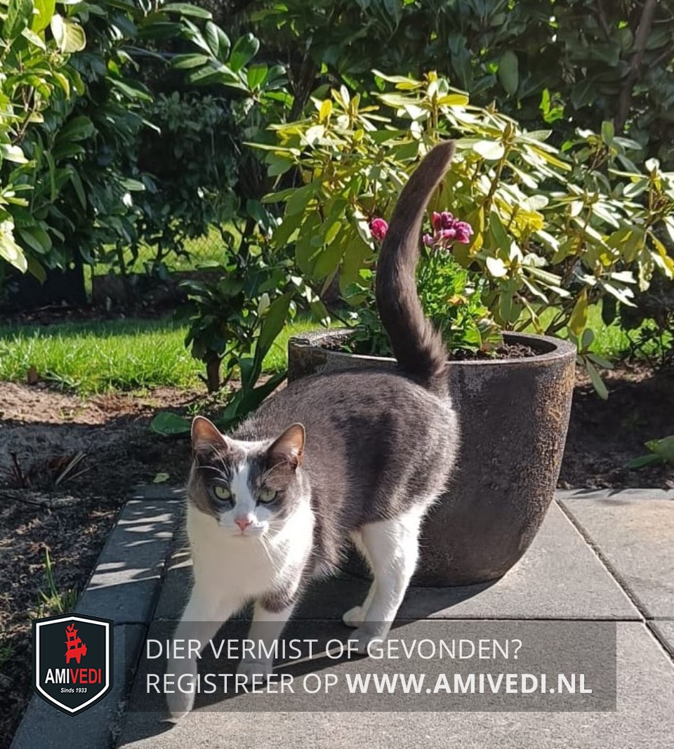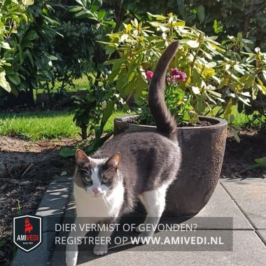 | Signalement | Grijs met wit. Wit snoetje met een wit maantje tussen de ogen. Witte borst en poten. Grijs, rondom de ogen, de rug en een grijze staart. Groene ogen. |