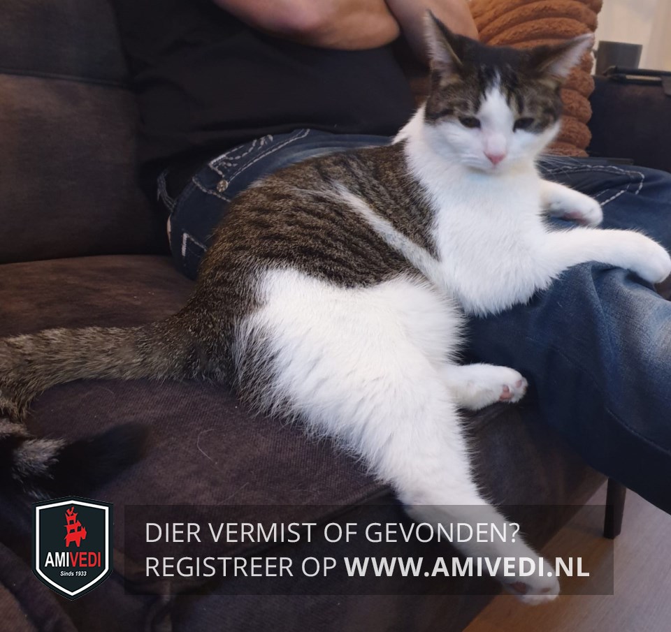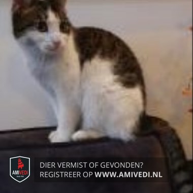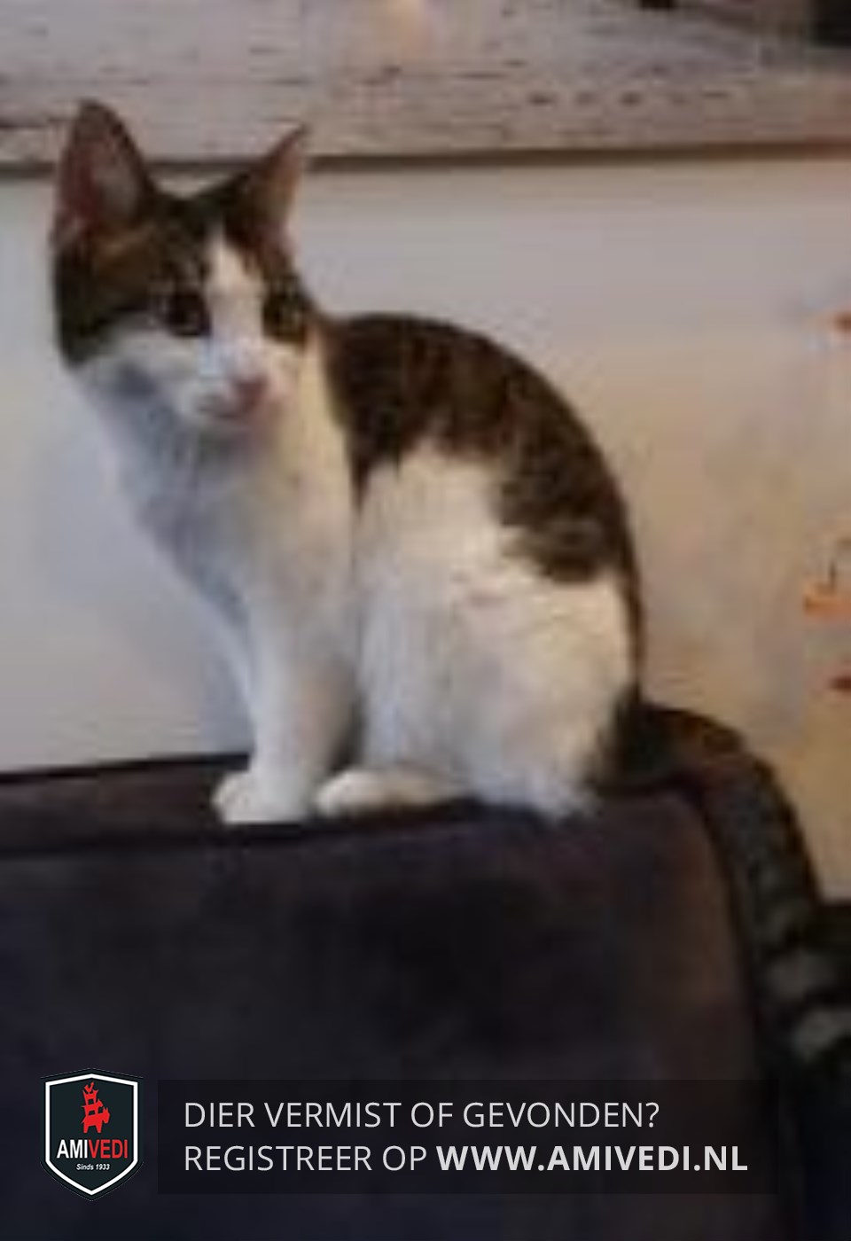 | Signalement | Cypers grijs/bruin/zwart op het kopje dat doorloopt over de slapen tot de oogjes. Omgekeerde witte midden op het voorhoofd, verder wit snuitje. Brede witte sjaal om de nek, witte borst, buik, heupen en pootjes. Op de rug en een beetje over de zijden cypers een cypers grijs/bruin/zwart dek, cypers grijs/bruin/zwarte staart. Zwarte staartpunt. Redelijk klein. Nieuwsgierig, beetje schuw. Reageert op haar naam. |