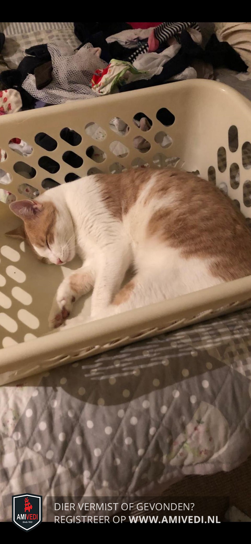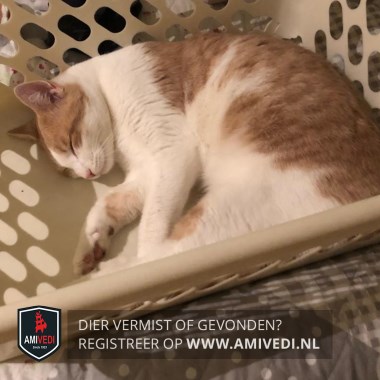 | Signalement | Wit-oranje kater oranje oren en bij de ogen, rest van de kop wit. Witte buik en voorpoten. |