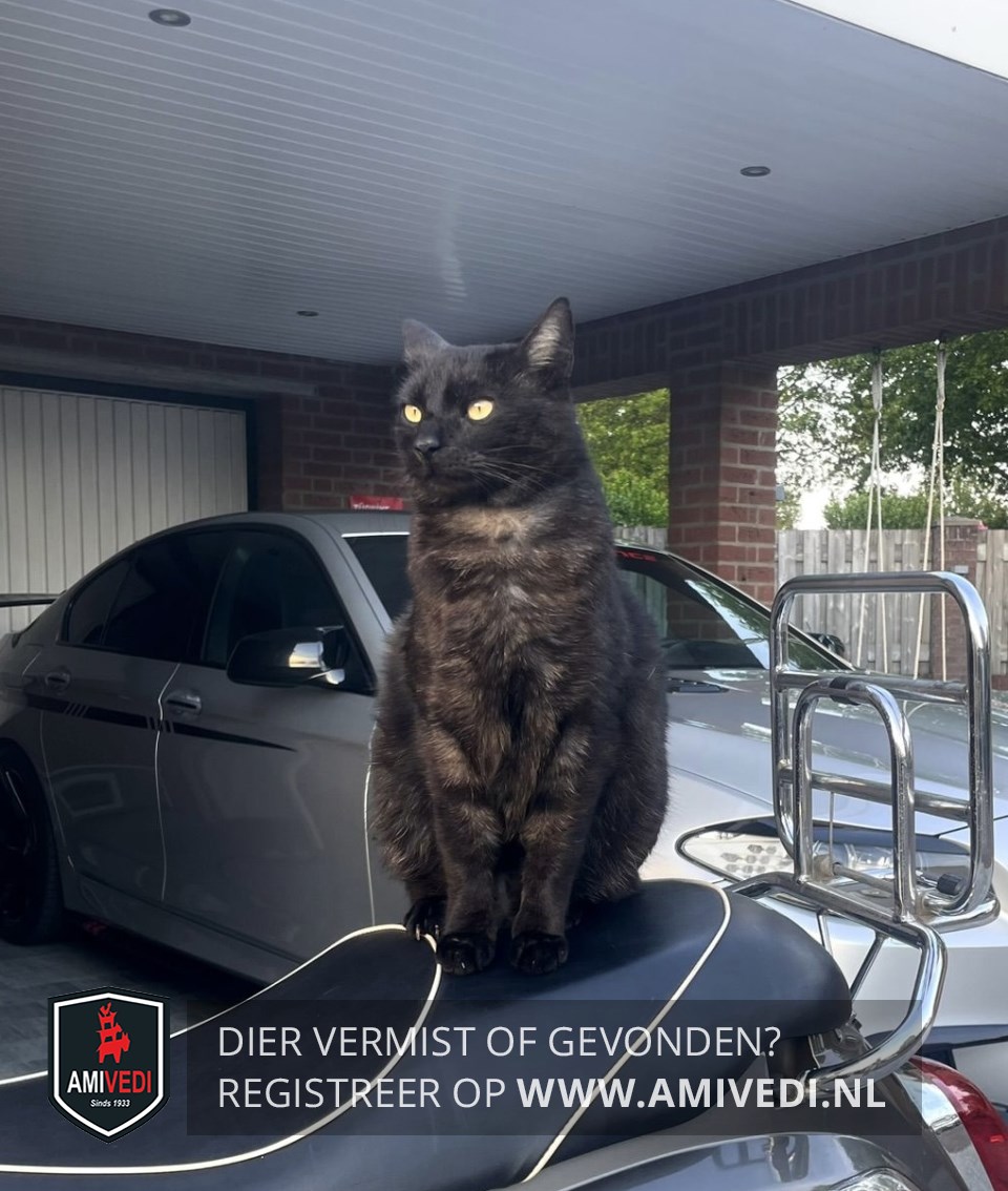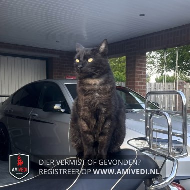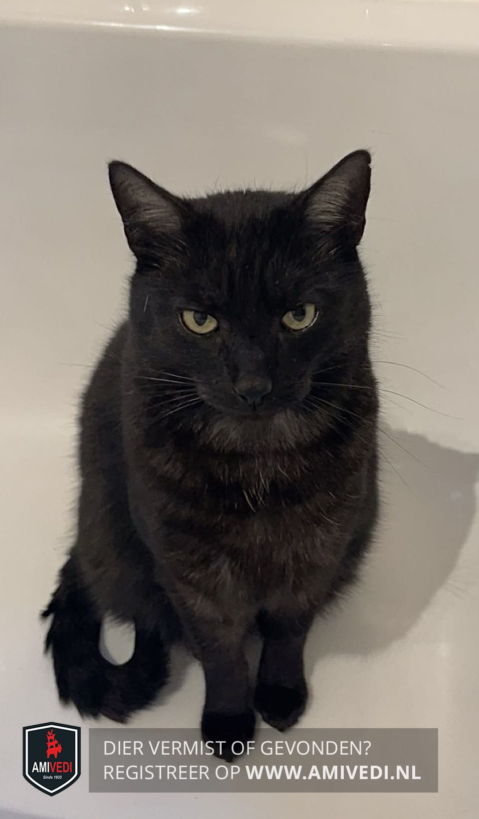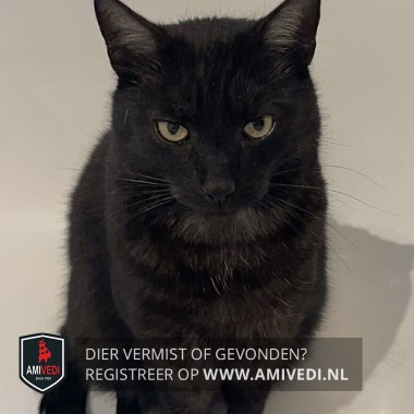 | Signalement | Zwart, met wat grijs/wit op de borst en voorpootjes, hapje uit zijn linker oor. |