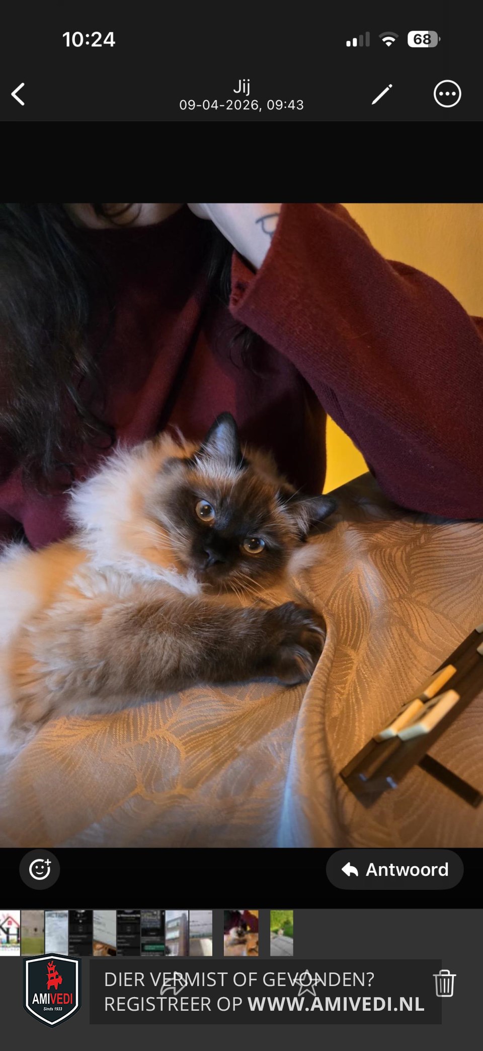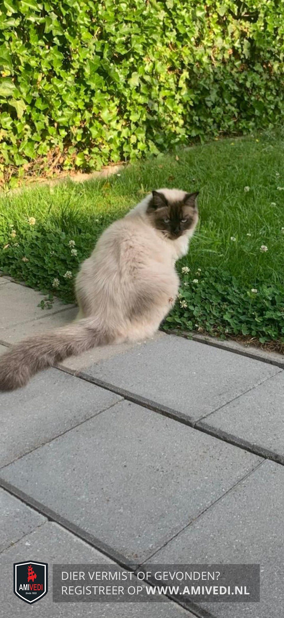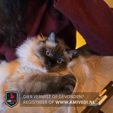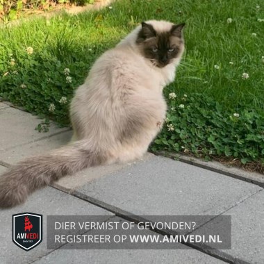 | Signalement | Ragdoll seal Point kater. Beige over het lijf met een zwart gezicht en oren. Einde van de staart en poten zwart. Een witte kraag. Angstig. |