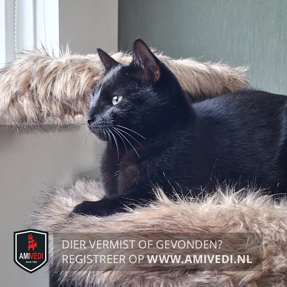 | Signalement | Zwarte slanke poes met een klein wit plukje op haar buik |