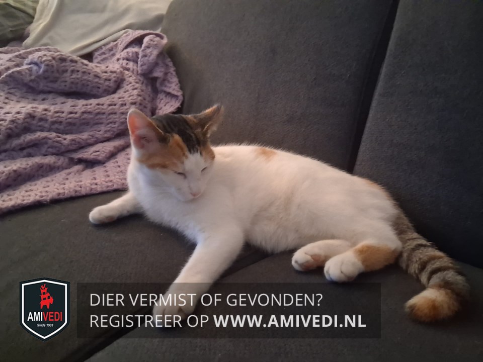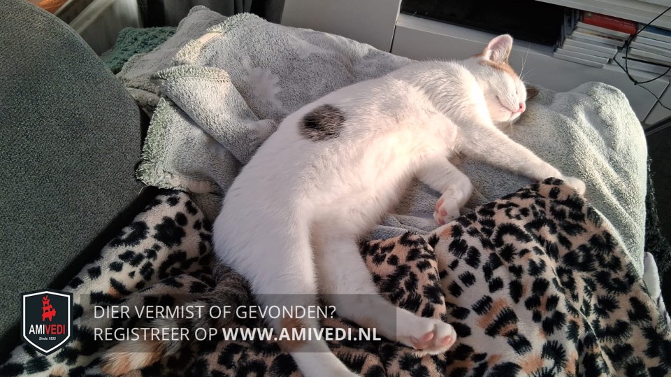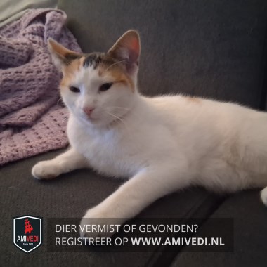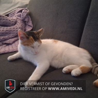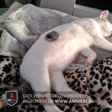 | Signalement | Lapje met heel veel wit. Cypers grijs met cypers rode vlekjes in het wit. Rechter oor rode bovenkant met grijs vlekje onderaan, rode vlek rechterzijde van het kopje aflopend langs het oog naar de wang, cypers grijs zwart gestreept vlekje vanaf midden kopje over het linker oor dat een klein rood vlekje heeft, tegen voorkant van het oor een rode vlek die bovenlangs het linkeroog loopt naar de wang, witte snuit, witte kin, witte borst, witte voorpoten, witte buik, rechterzij een cypers grijs vlekje, linker zij een klein rood vlekje, achterpootjes wit met op de hak van de linker achterpoot een rode vlek en op de zijkant van de rechterachterpoot een klein rood vlekje aan de buitenkant, staart is grijs zwart geringd |