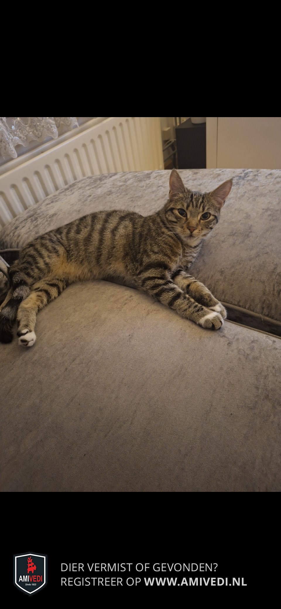 | Signalement | Cypers bruin-zwart met wat wit op voetjes. |
