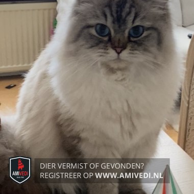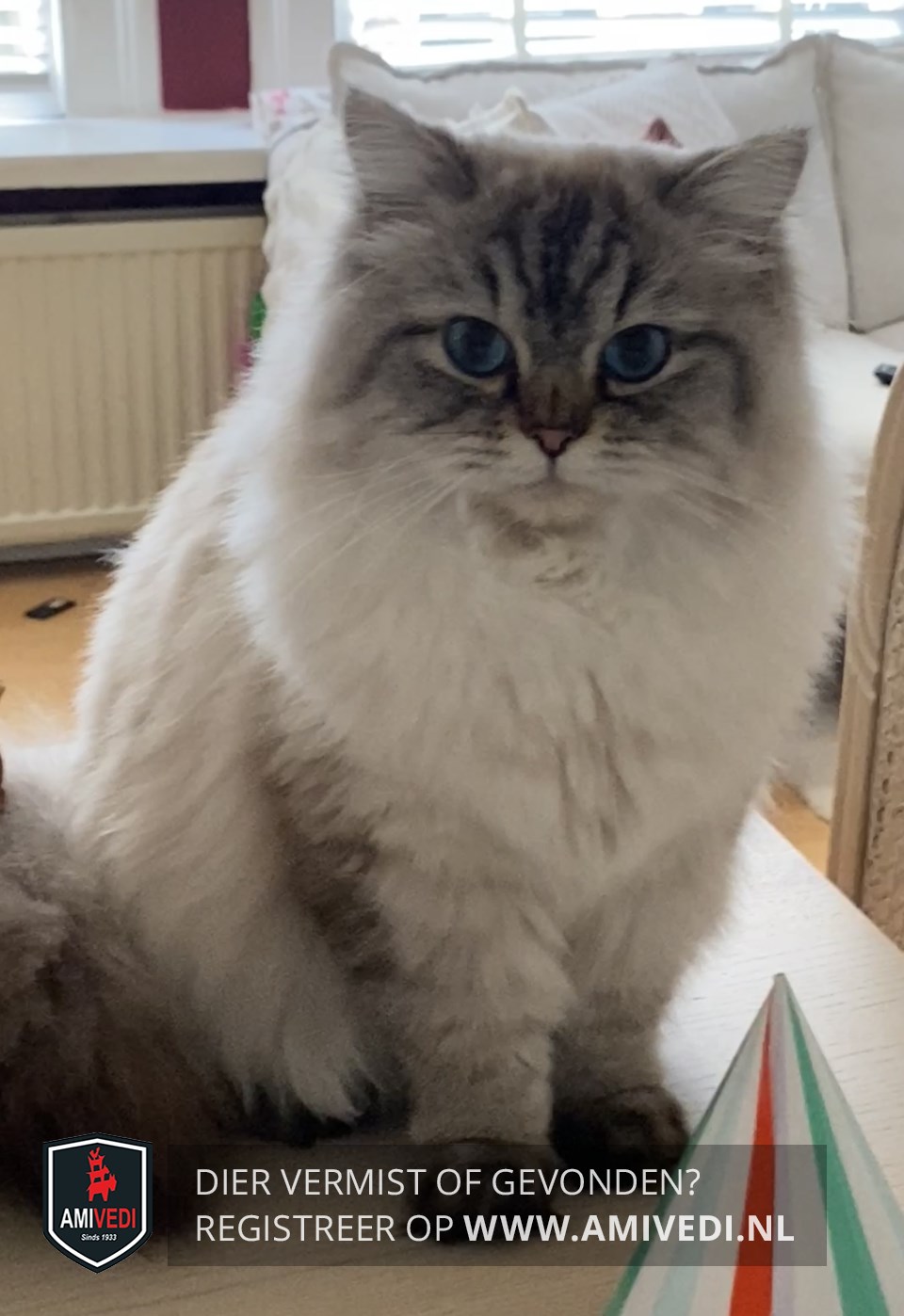 | Signalement | Grijs cypers gestreept met wit (blue linx point): cypers grijs gestreept masker, bruin neusje met roze neuspunt. Wit/ beige lijf. Poten en staart grijs-bruin cypers. Blauwe ogen |