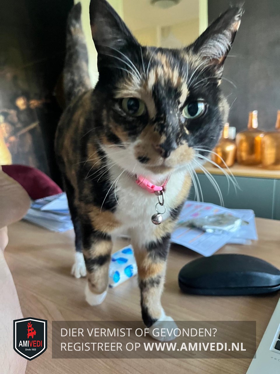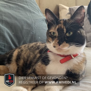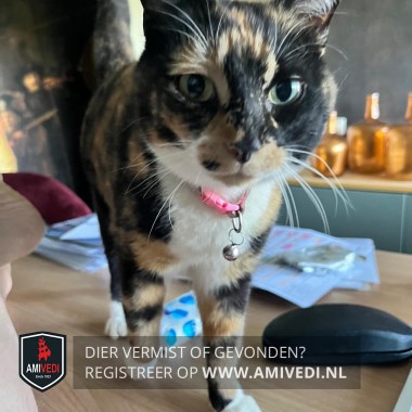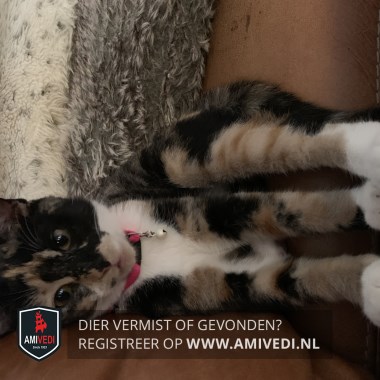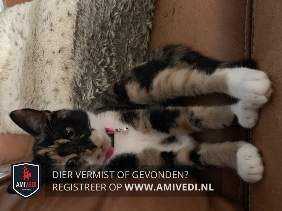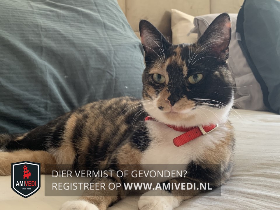 | Signalement | Schildpad met wit. Kleurschakering Zwart-rood/oranje. Linkerkant kop voornamelijk zwart tot de kaak. Zwarte neusbrug. Neus voornamelijk zwart, rechts hoekje van de neus bruin. Linker snorhaarkussentje rood/oranje met aan de onderzijde wit. Rechter snorhaarkussentje rood/oranje met een klein zwart vlekje. Kin licht rood/oranje. Witte bef en borst, in het midden op de borst tussen de voorpoten zwart vlekje. Schildpad vacht rug, zijflanken en start. Voorpoten schildpad vacht met witte voetjes. Achterpoten schildpad vacht met witte sokjes. Kleine stevig dame met een norse /schrikkerige blik (door haar tekening). |