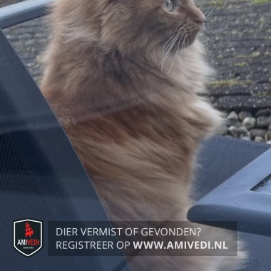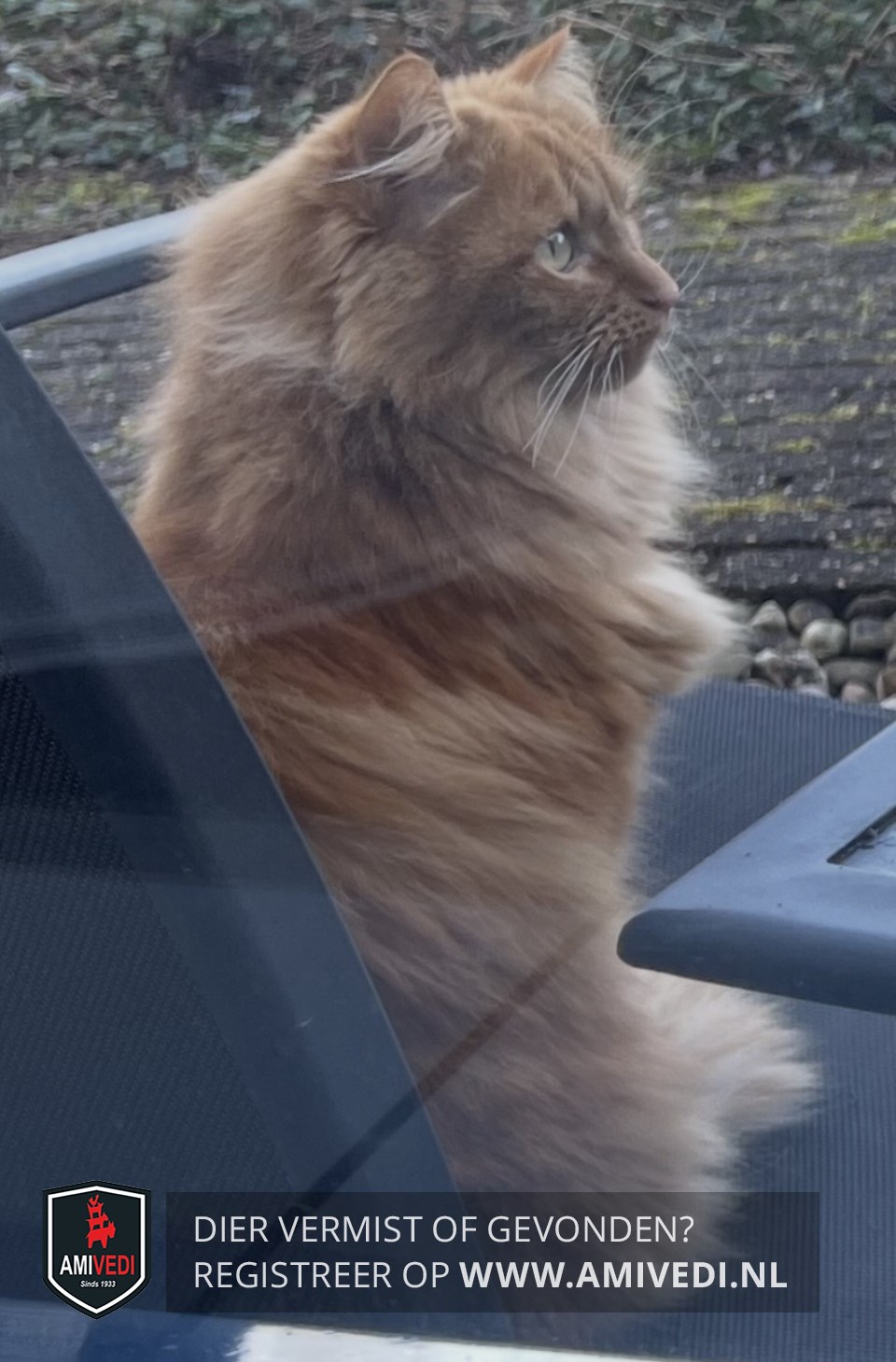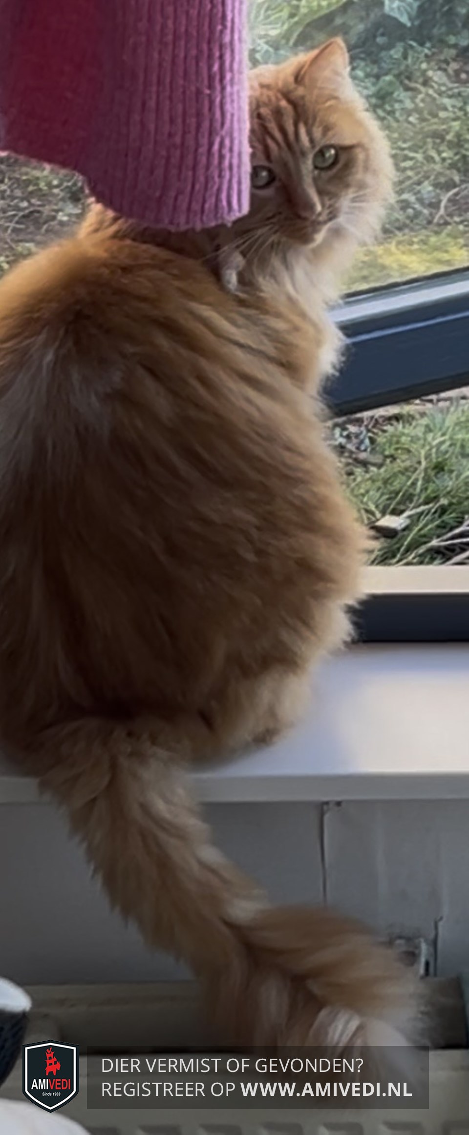| Signalement | Rode half langharige poes met enkele zilver/witte accenten. Ze heeft een wit/zilveren streep over haar rug en door haar staart. Zij is van achteren wat meer geschoren waardoor het uiteinde van haar staart dikker oogt. Oker ogen. |