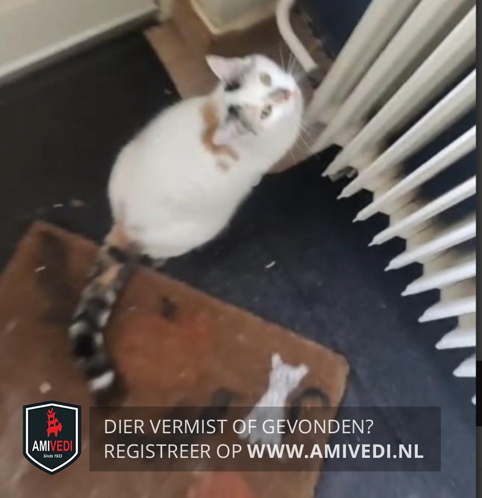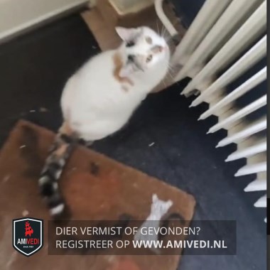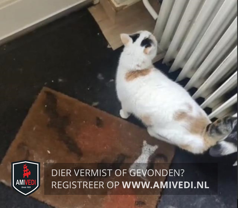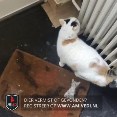 | Signalement | Wit/zwart/bruin. Hoofdzakelijk wit. Witte snoet, gezicht en bles.. Zwarte vlek bij elk oor. Rode vlekken op de rug. Zwart/(wit)-grijs- bruine staart. Kat is niet bekend met deze omgeving. |