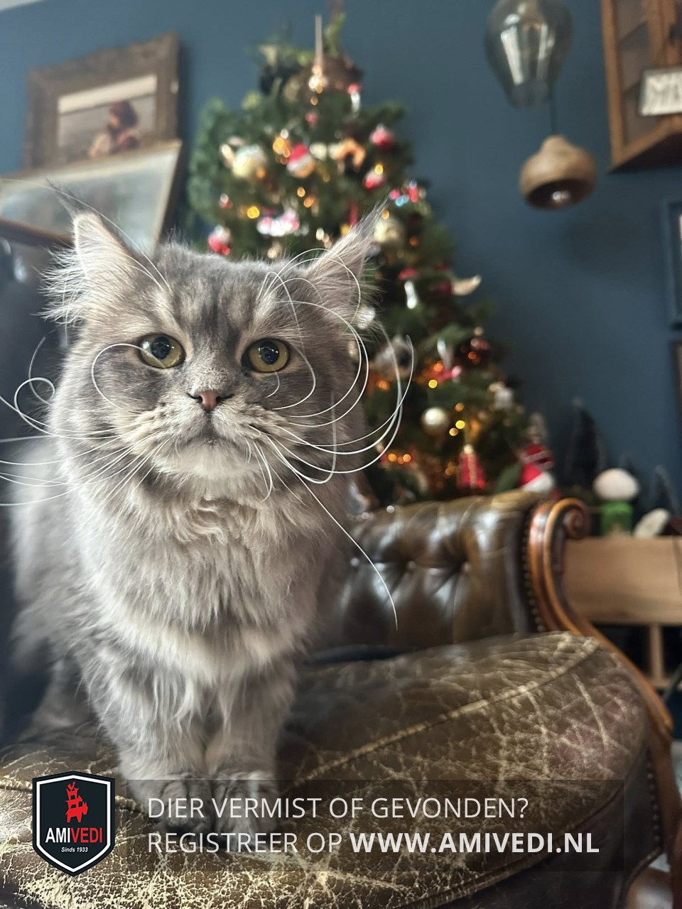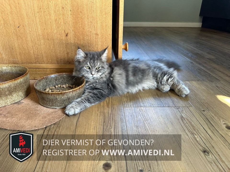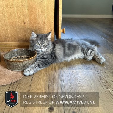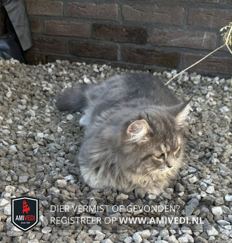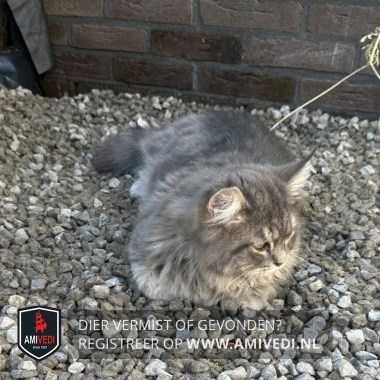 | Signalement | Lichtgrijze langharige kruising Boskat met een gestreept kopje , wit rond de neus en lippen, wit kinnetje en een volle borst en bef, wit aan de buik , met een gemarmerd grijs lijfje, en gestreepte pootjes. Heeft een volle pluimstaart. |