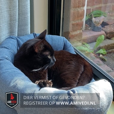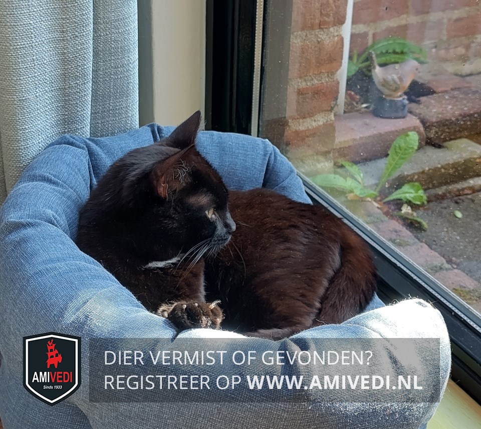 | Signalement | Slanke zwarte poes met wit vlekje onder kin |