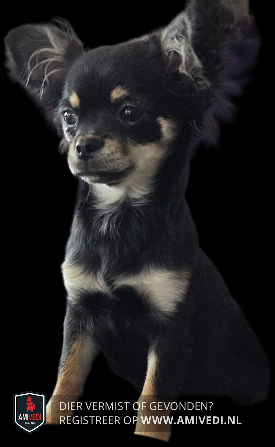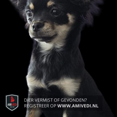 | Signalement | Zwart met bruin en witte Chihuahua, zwart bovenop de kop, bruine vlekjes boven de ogen, zwarte bles, snuit bruin met zwarte stipjes, witte keel, zwarte borst, voorpoten voornamelijk bruin |
