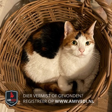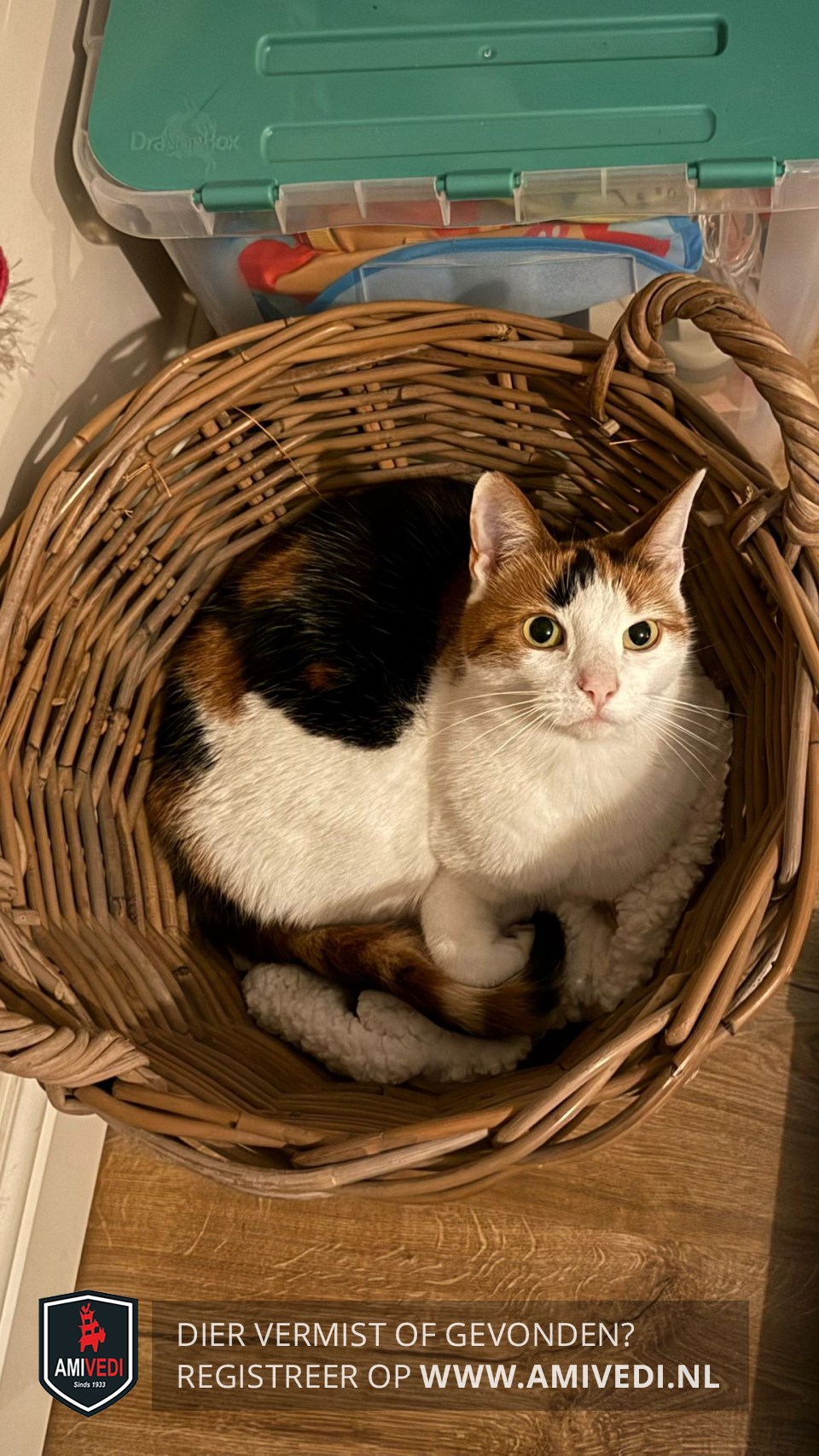 | Signalement | Wit/zwart en oranje/rode lapjeskat. Op het kopje zitten oranje/rode en zwarte vlekken. De ogen zijn geelgroen (Heeft boven haar linker oog een wratje) en het neusje is roze. Het snoetje is wit en loopt wit door naar de borst, buik en poten. Op de rug en kop zijn oranje/rode en zwart gemengde vlekken. |