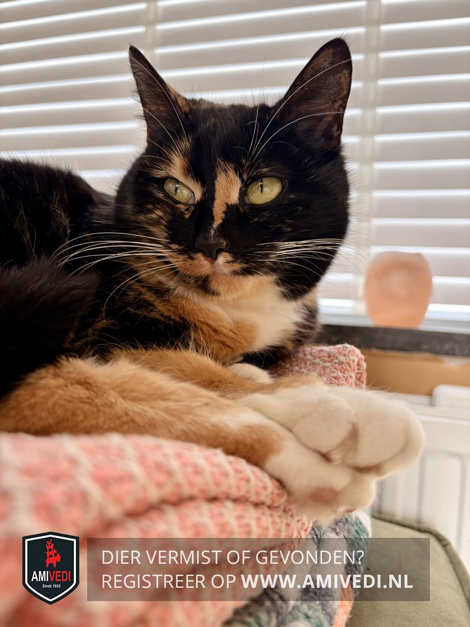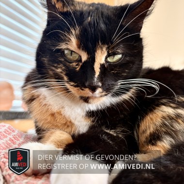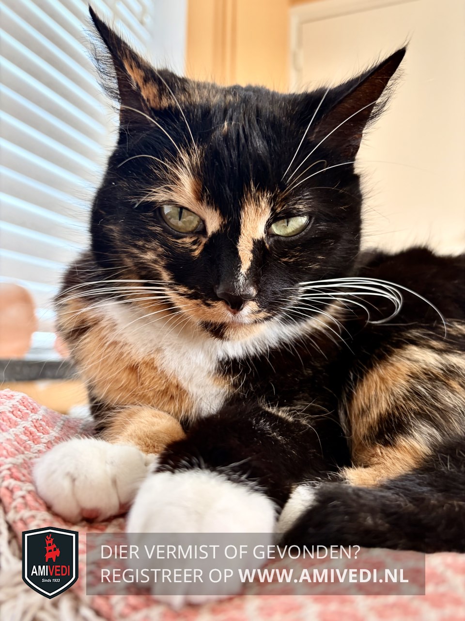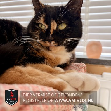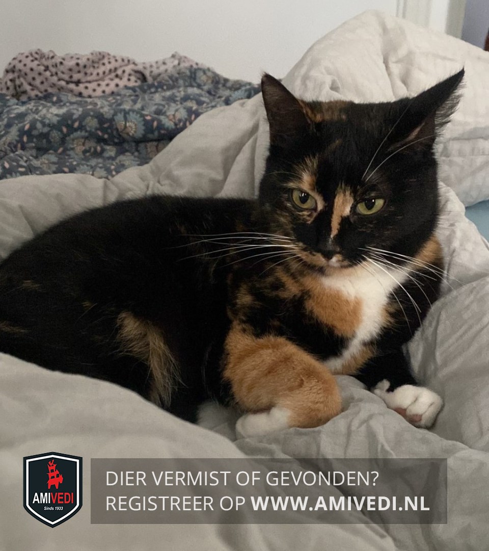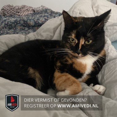 | Signalement | Zwart links op neus rood en wat rood boven rechter oog, rood op bekje, witte kin en wit en rood op bef, wat rode vlekjes op lijf, rechter voorpoot rood met wit voetje, linker voorpoot zwart met wit voetje. |