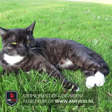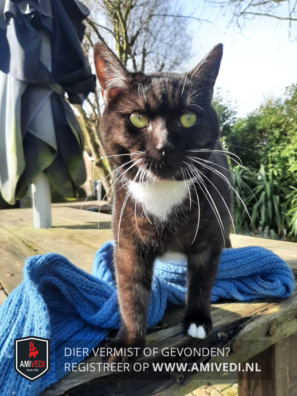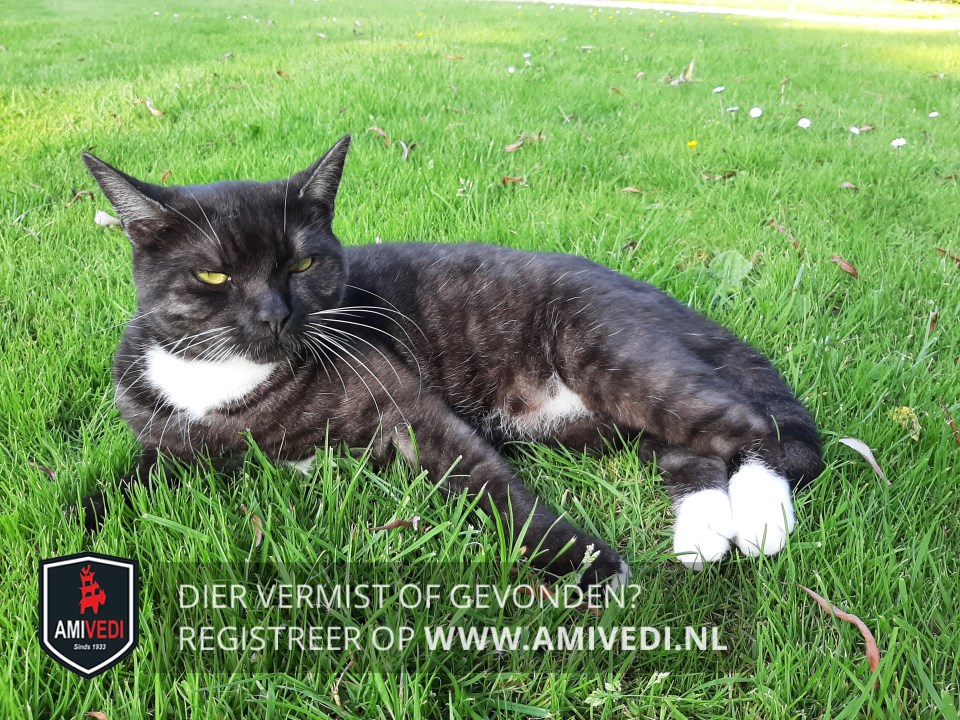 | Signalement | Zwart/wit. Witte ondervacht. Witte bef in een v-vorm. Witte vlek op borst en buik. Witte sokken achterpoten, twee witte teentjes links voor. Opvallend lange witte snorharen. Smoke kleur, cyperse tekening in de ondervacht. |