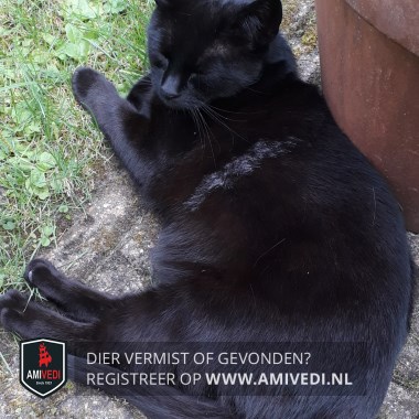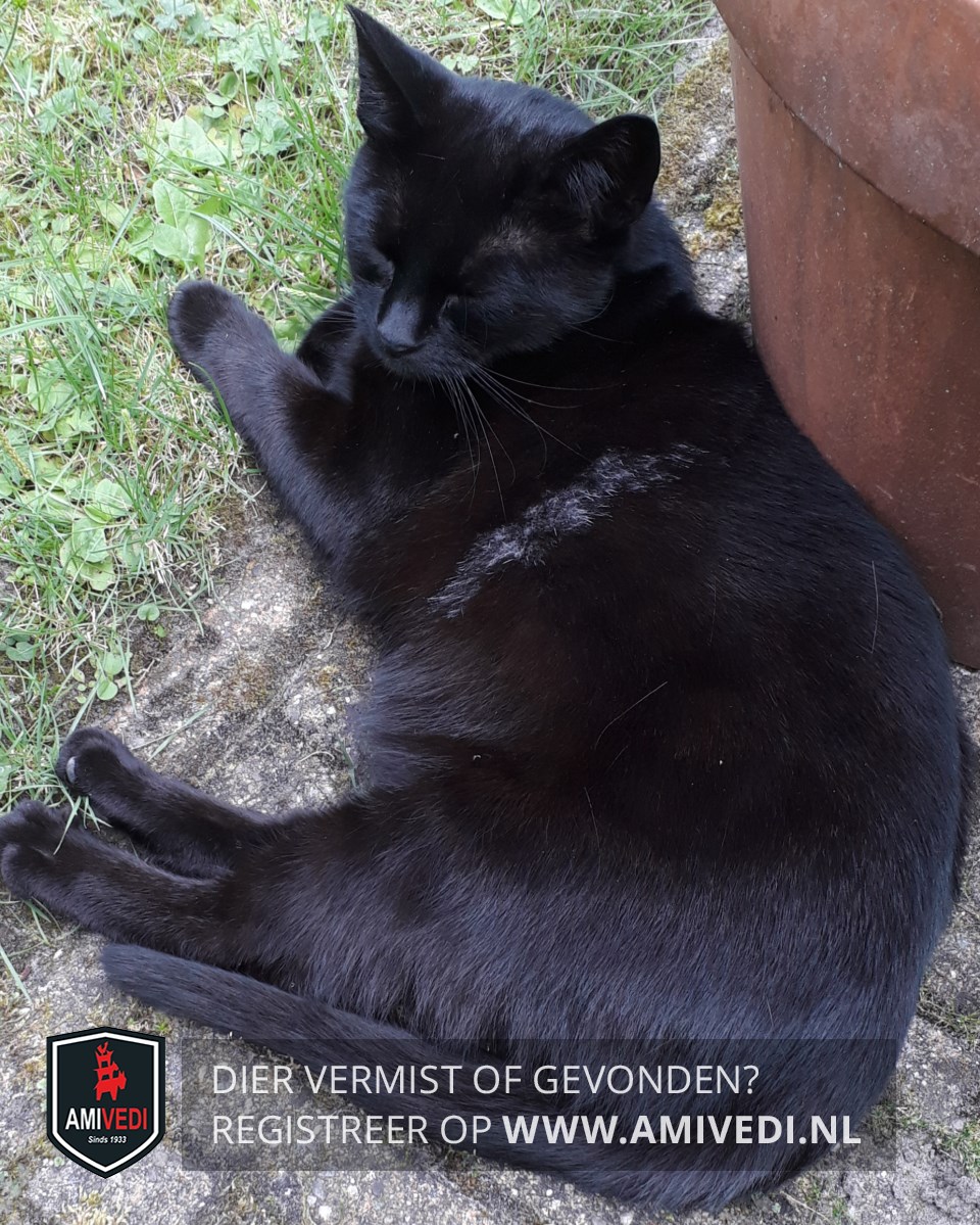 | Signalement | Geheel zwart met een witte veeg aan de linkerkant achter de voorpoot. |