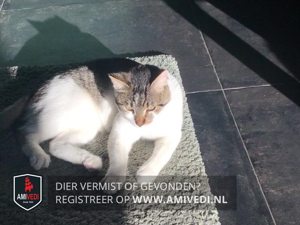 | Signalement | Cypers grijs zwart gestreept met wit Cypers grijs zwart op de kop en over de ogen naar de wangen en neusbrug met een afloop op de linkerzijde van de neusbrug, wit vanonder de oogjes uitlopend in een witte snor, witte kin, witte borst, witte voorpootjes, witte buik, witte achterpootjes, op de rug cypers grijs zwart gestreept vanaf de schouders over de hele rug en staart. |