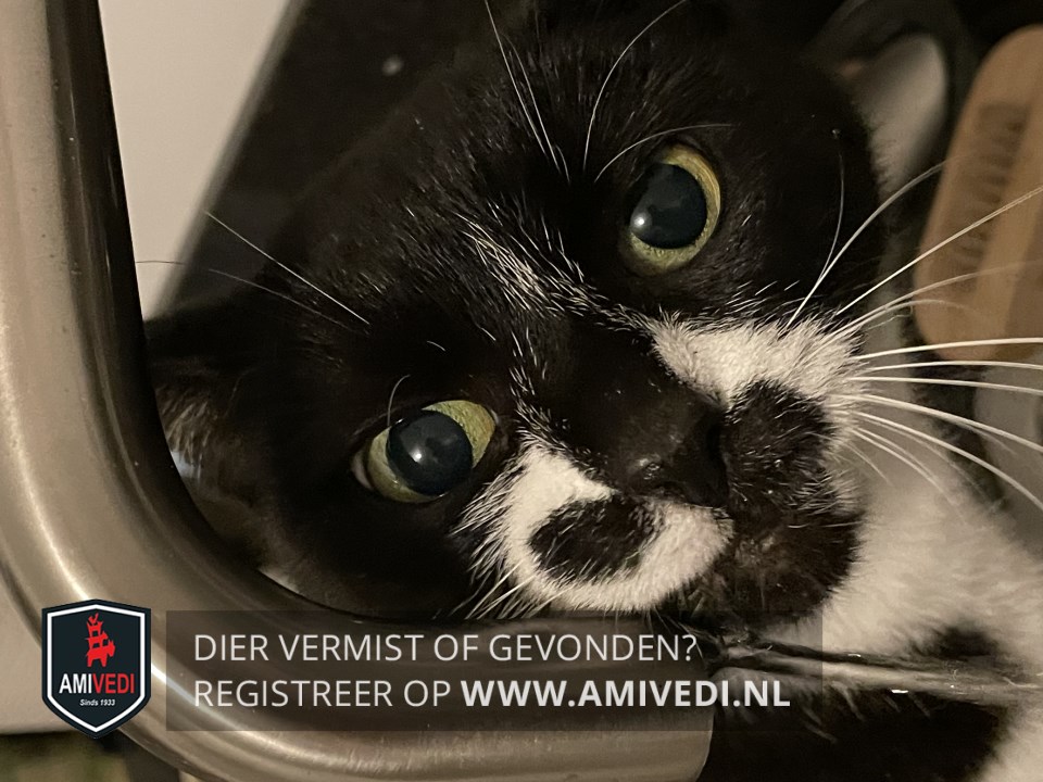 | Signalement | Zwart wit, klein van bouw Zwarte kop aflopend over de neusbrug en met een ronde vlek links naast de neus, vage witte lijn in een punt van de linker oog binnenhoek op het voorhoofd naar de rechteroog binnenhoek, it vanaf onder de ogen naar een halve snor in een halve boog rechts van het kopkje links vanonder het oog naar de bovenlip, zwarte halfsnor rechts onder de neus, zwarte kin, witte borst. |