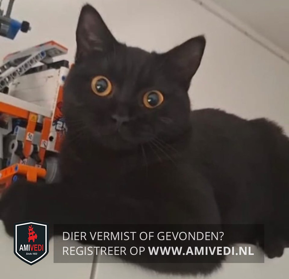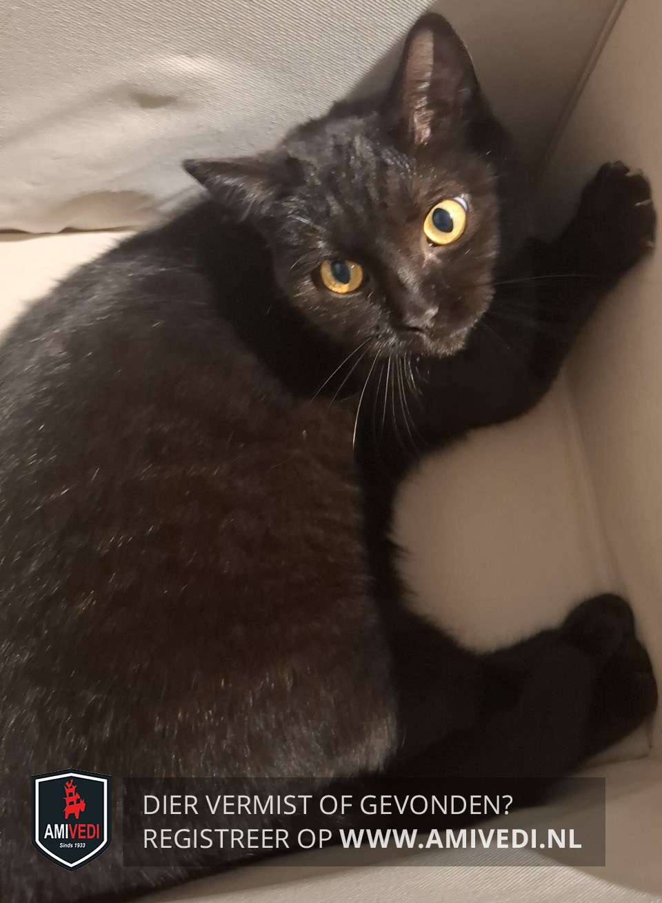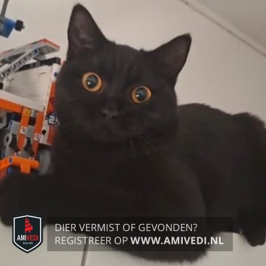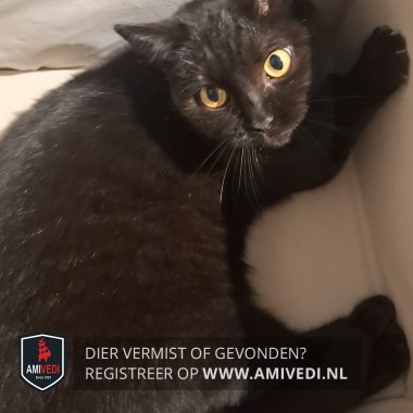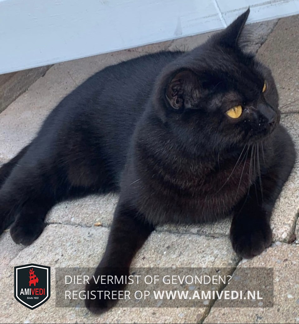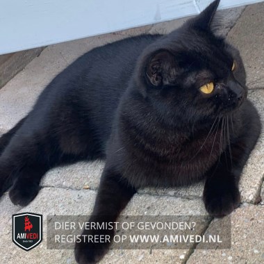 | Signalement | Volledig zwart, grote oranje/goud-gele ogen. |