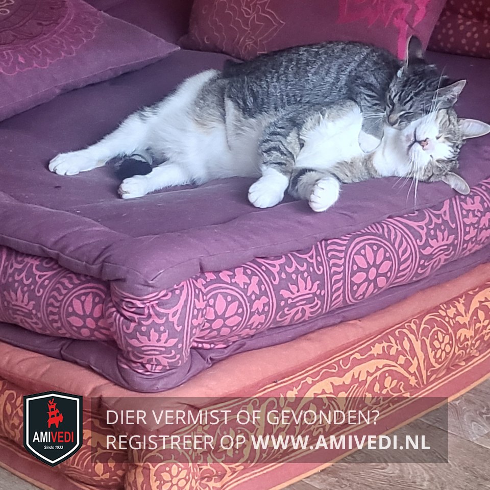 | Signalement | Grijs/zwart/bruin gestreept met witte kin en bef, witte voetjes, zwart staarteinde. |