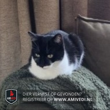| Signalement | Links bij de snorharen wit, rechts zwart. Witte kin, bef, borst en buik. Zwart kopje, rug en staart. |