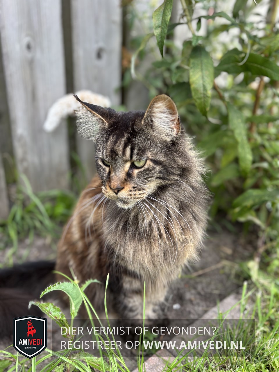 | Signalement | Cypers grijs met zwart en bruin. Bruin snoetje. Zwart petje. Lijfje is gemêleerd grijs/bruin. Zwarte strepen over de poten en staart. Staart is bijna helemaal zwart. |