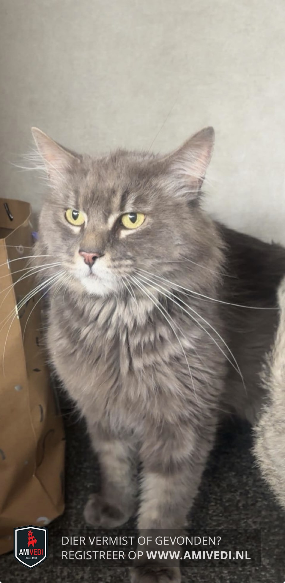 | Signalement | Cypers grijs met donker grijs. Wit rond de bek |