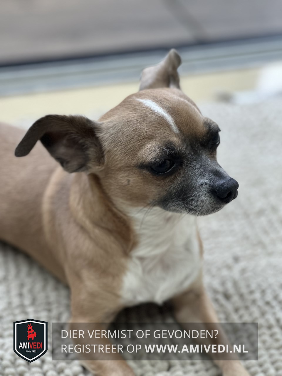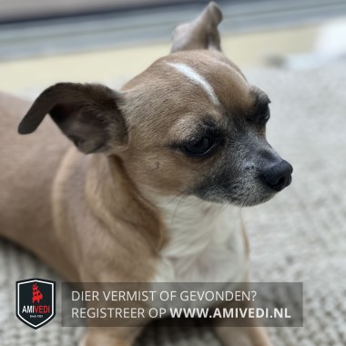 | Signalement | Beige/blonde met witte Chihuahua, bruine kop, met smalle witte streep in het midden van de kop, zwarte neus, witte keel en borst, bruine rug en flanken. |