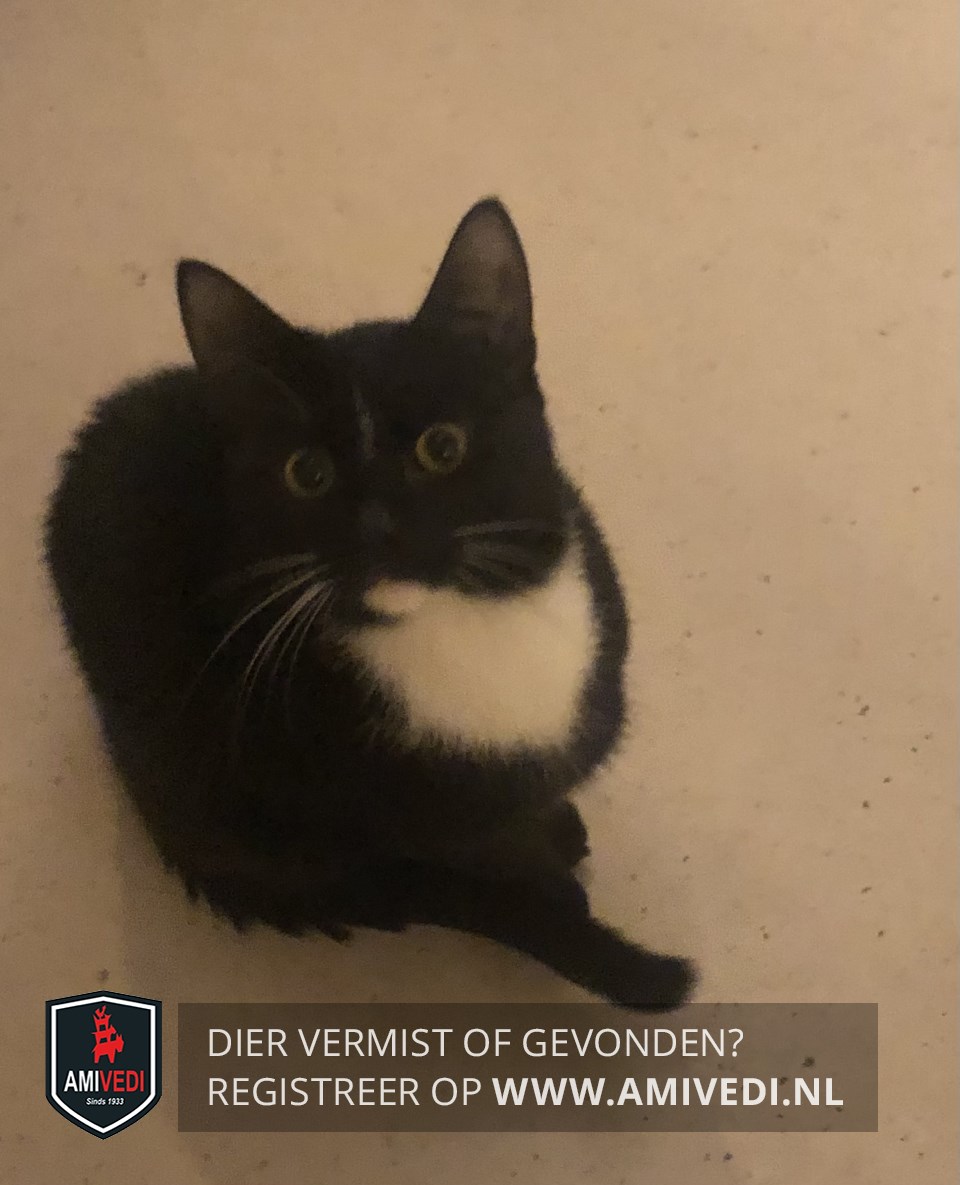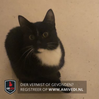 | Signalement | Zwart met wit. Dun wit streepje bles, witte kin, bef/ borst en voetjes. Slanke kortharige kat. |