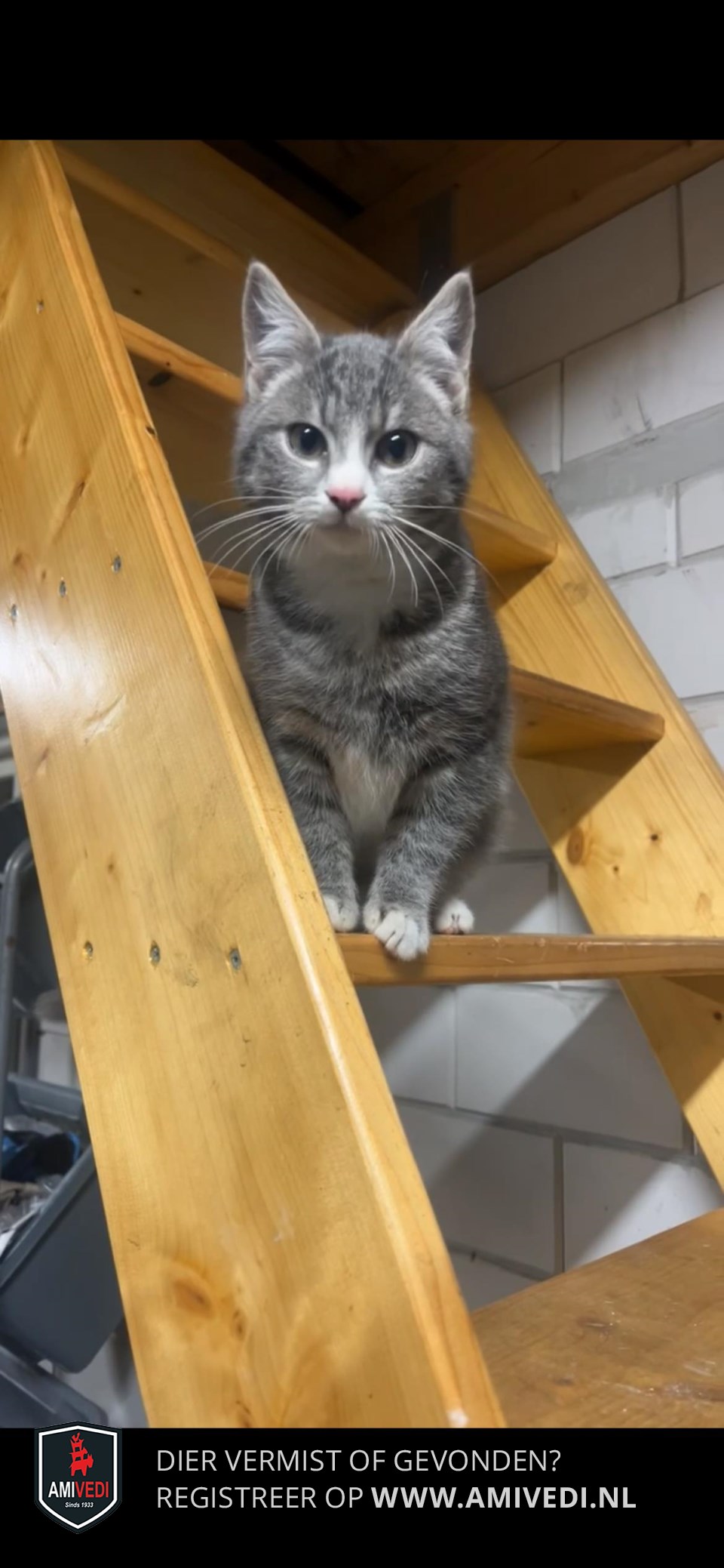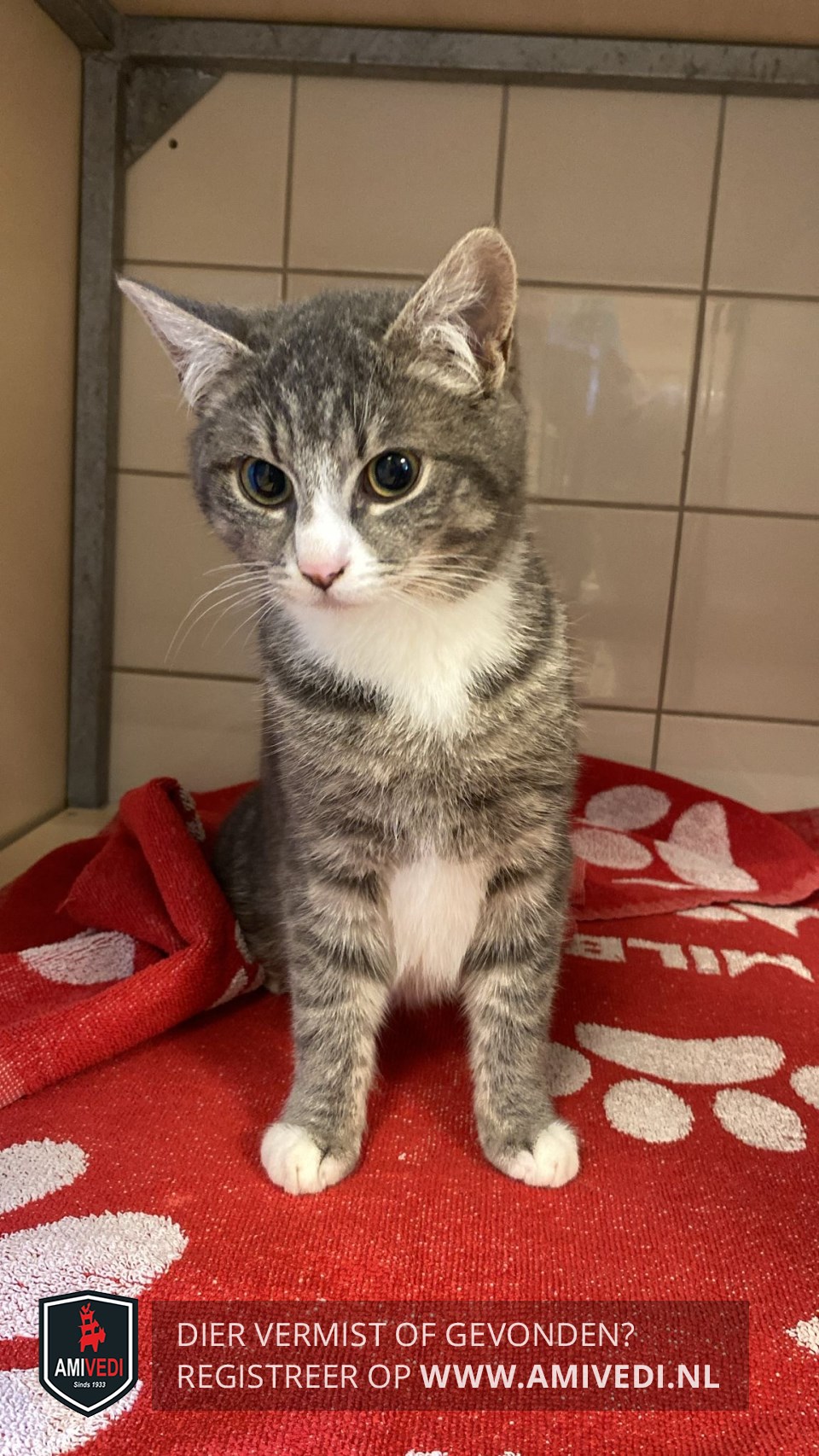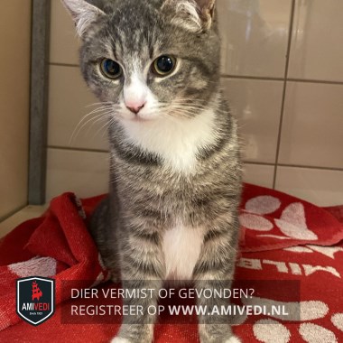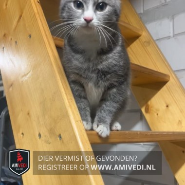 | Signalement | Klein poesje (2,3 kg) met een grote dikke staart., wit snuitje/hals/bef/op buik/voetjes en een roze neusje. |