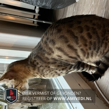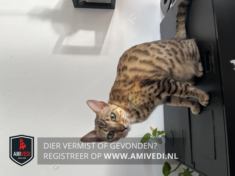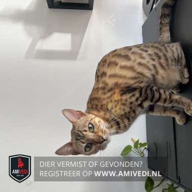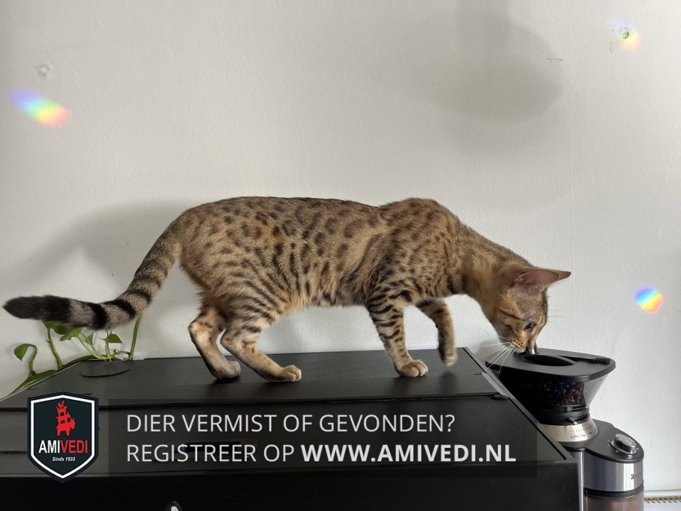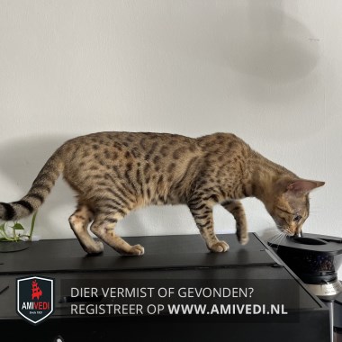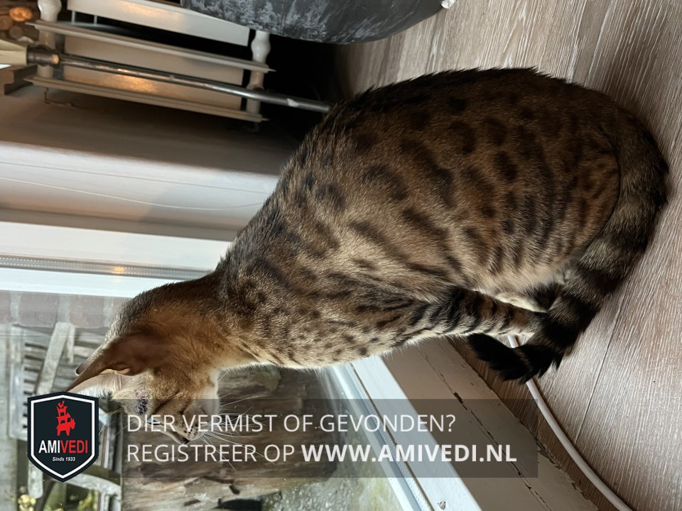 | Signalement | Brijn, zwart, wit Bengaal: Witte kin, zwarten vlekken over hele lichaam . Staart heeft zwarte strepen. Oren geen haren. Heeft een allergie, wat veel jeuk geeft en zich dan tevens open krabt. Krijgt hier speciaal voer voor. Beetje schichtig, wil liefste niet opgepakt worden. |